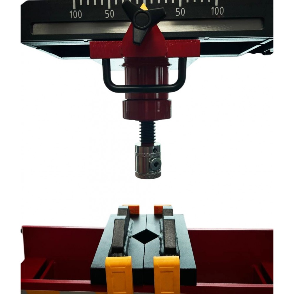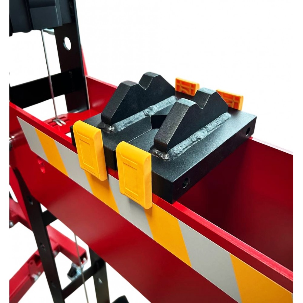 - Точне позиціонування без пересування деталі: каретка дозволяє переміщувати гідравлічний циліндр вліво або вправо на 10 см вздовж верхньої балки рами. Це дозволяє точно виставити пуансон над місцем натискання, навіть якщо деталь велика, важка або має складну форму.