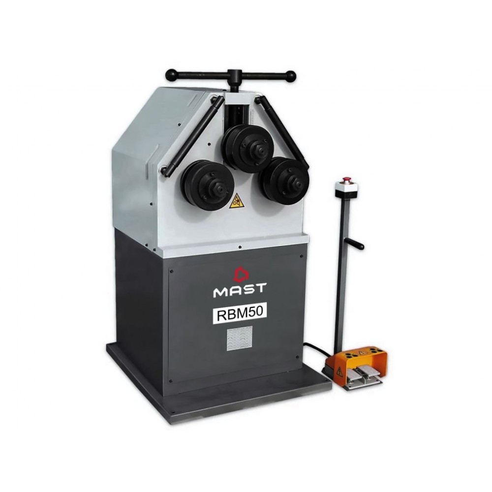 Електромеханічний верстат MAST RBM50 - це потужний інструмент для згинання профільних труб, прутка, смуги та іншого типу профільного прокату. Масивна, стійка конструкція з двома приводними роликами із загартованої сталі забезпечує стабільність в роботі і максимальну точність виконання завдань. Ролики мають можливість регулювання ширини. Діаметр валів становить 50 мм, твердість - HRC48-52.
