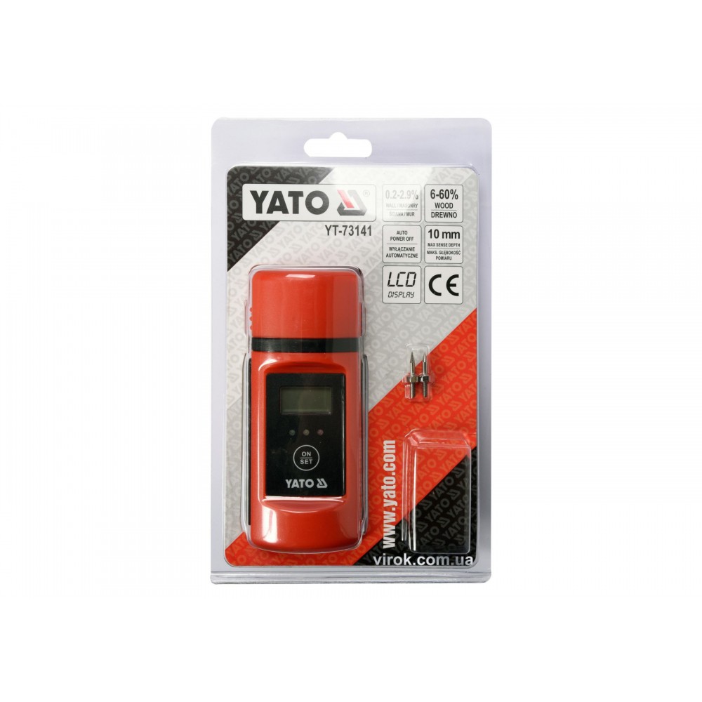 Вологомір YATO YT-73141 - прецизійний гігрометр, призначений для контролю вологості штукатурки, підлогових покриттів, дощок і конструкційної деревини при будівельних або реконструкційних роботах. Також використовується для перевірки вологості деревини для камінів, коптильників і печей.