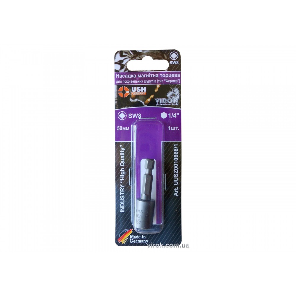 Торцева насадка від німецької фірми USH довжиною 50 мм, призначена для шурупів із зовнішнім шестигранником М8. Виготовлена з високолегованої спецсталі, хрома, нікелю, кремнія, молібдена, ванадія. Сильний постійний магніт NEODYM міцно тримає шуруп. Індустріальна якість виконує найвищі потреби професійного застосування.