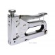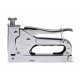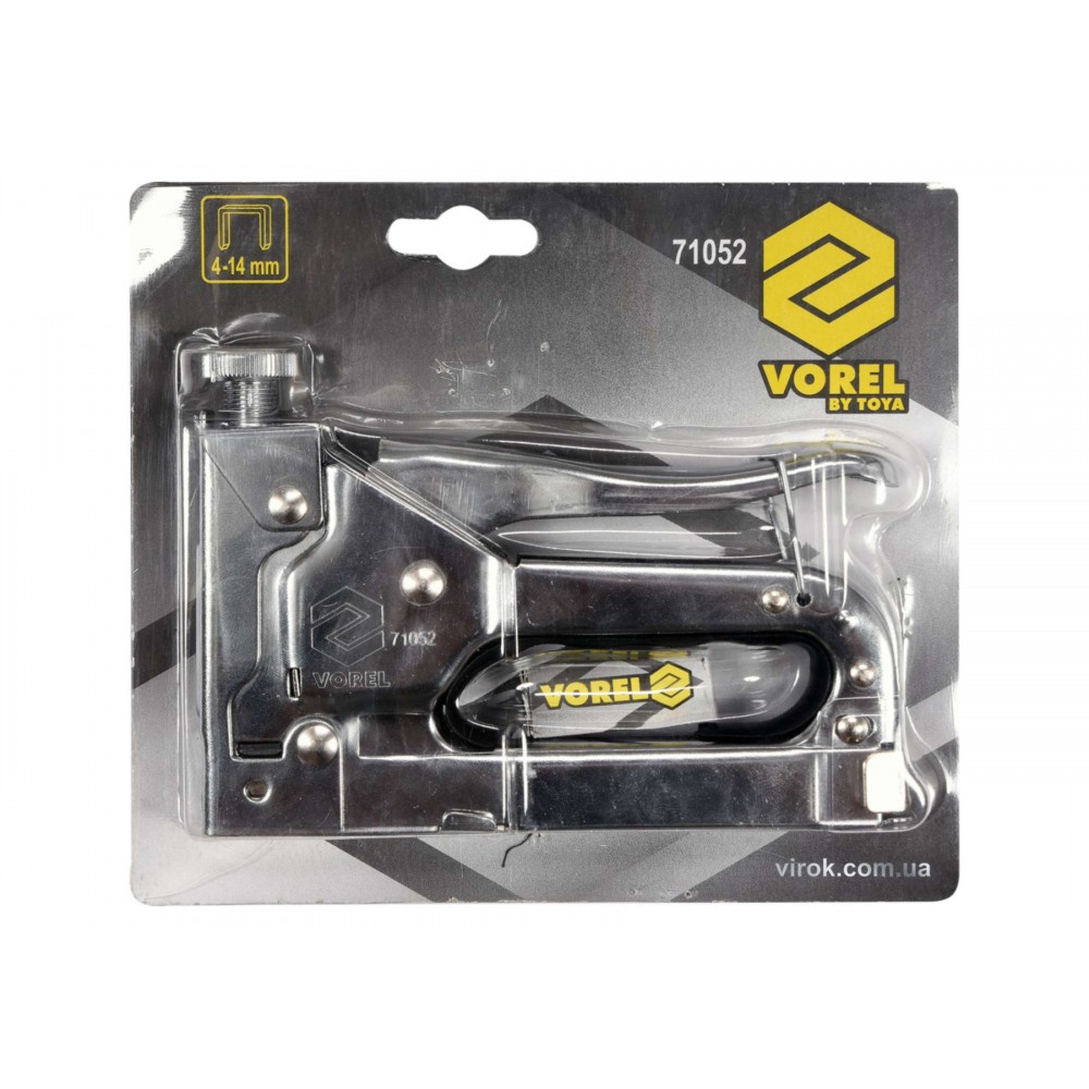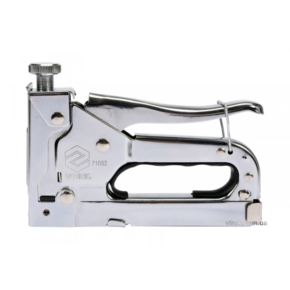 Степлер для оббивки Vorel 71052. Степлер для оббивки призначений для швидкого з’єднання різних матеріалів, наприклад дерева з тканиною, картоном, папером або шкірою. Використовується для оббивки, покрівлі, декорування, оздоблення будівель тощо. З’єднує матеріали за допомогою сталевої скоби, вбитої з великою силою. Степлер призначений для забивання типових сталевих прямокутних скоб довжиною від 4 до 14 мм. Степлер з регульованим тиском бойкової пружини - регульована сила удару.