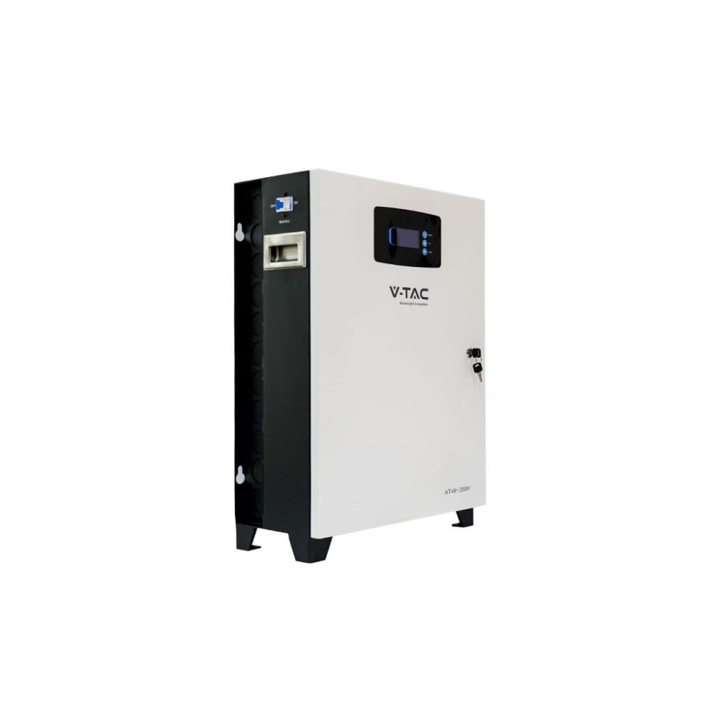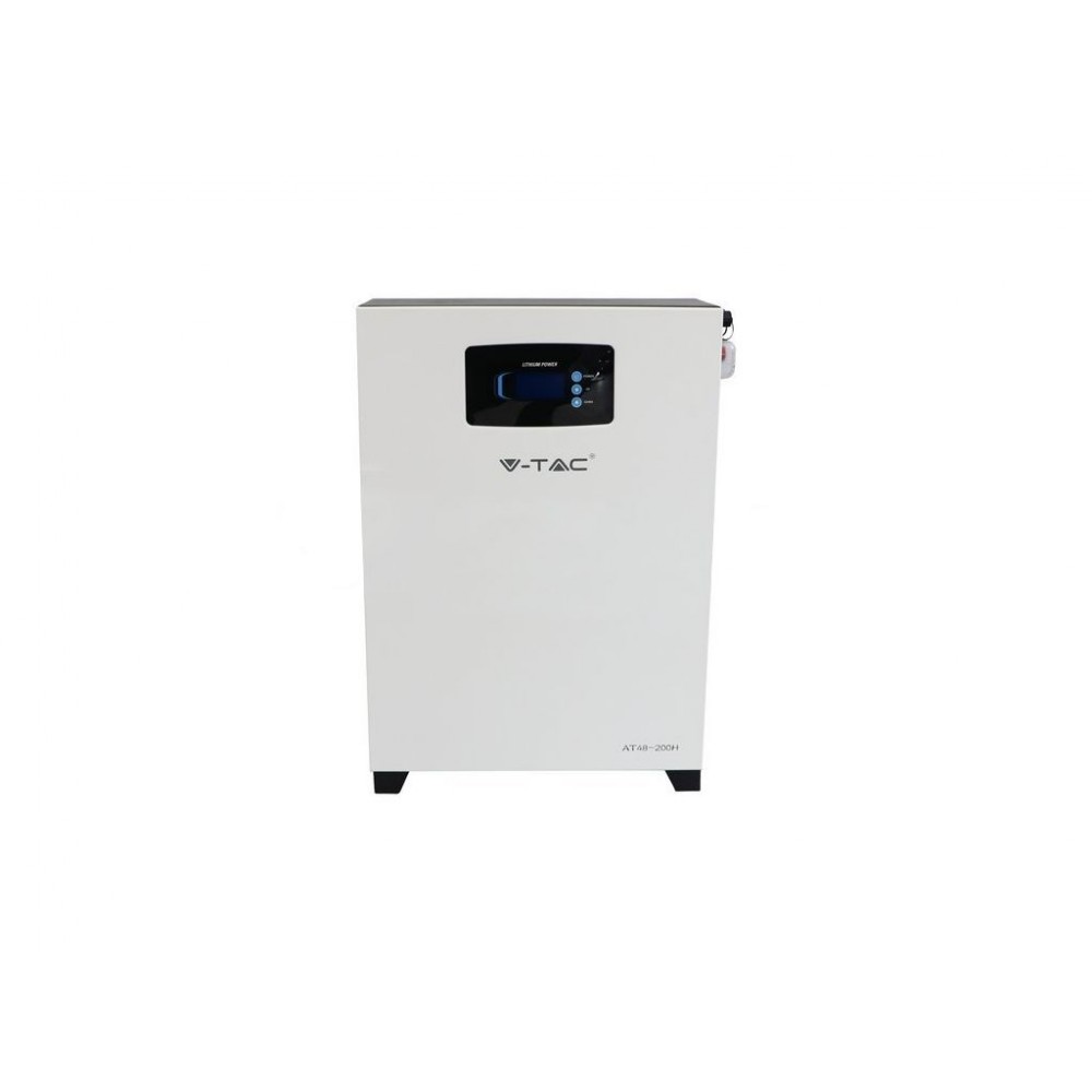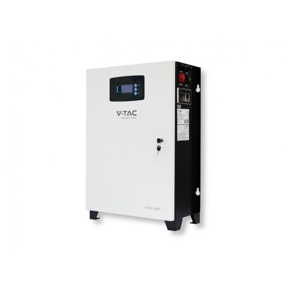 LiFePO4 енергонакопичувач V-TAC для фотоелектричних інверторів здатний зберігати електроенергію до максимальної потужності 10,24 кВт·год. Він має тривалий термін служби, здатний здійснювати більше 5000 циклів зарядки/розрядки. Модель оснащена кронштейнами для настінного кріплення і фронтальним світлодіодним дисплеєм, що дозволяє швидко контролювати параметри і стан батареї.