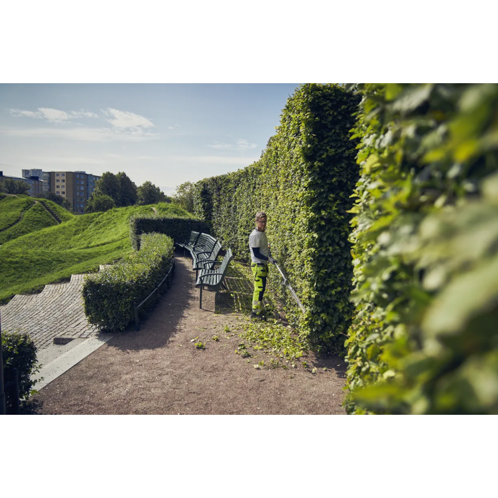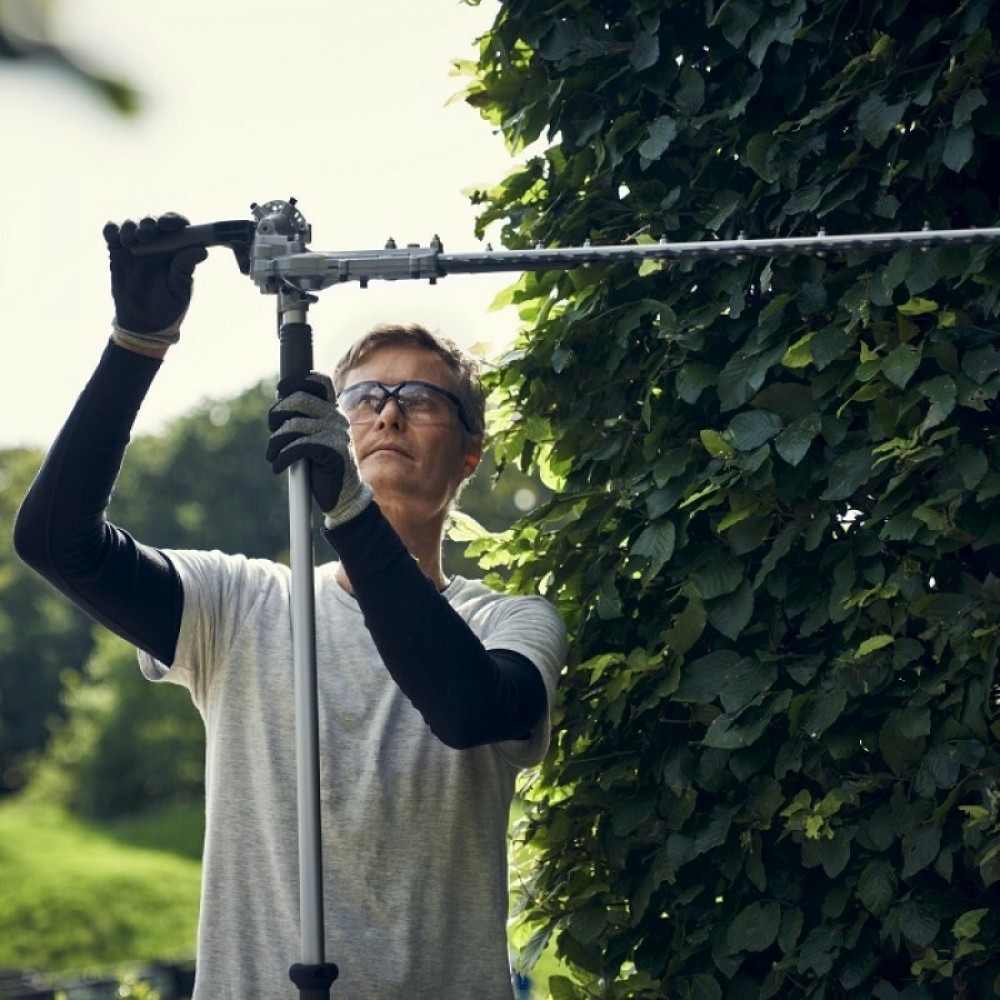 Husqvarna 525iHE4 - акумуляторні ножиці для догляду за живоплотом на висоті до 4 метрів без використання драбин. Модель підходить для професійного застосування в комунальному господарстві, садівництві та ландшафтному дизайні. Поворотні різальні леза довжиною 60 см полегшують підрізання огорож різної висоти та щільності.