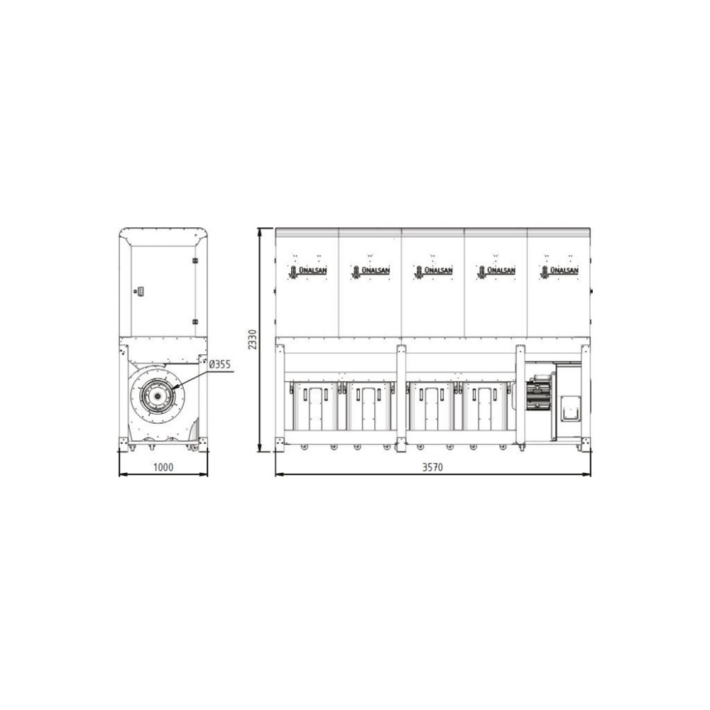 Пил і відходи від деревини збираються в викатні металеві бункери, які також встановлені на поворотних пластикових колесах, для зручності їх подальшого спорожнення. На кожному бункері є великі оглядові вікна для візуального контролю їх наповнення.