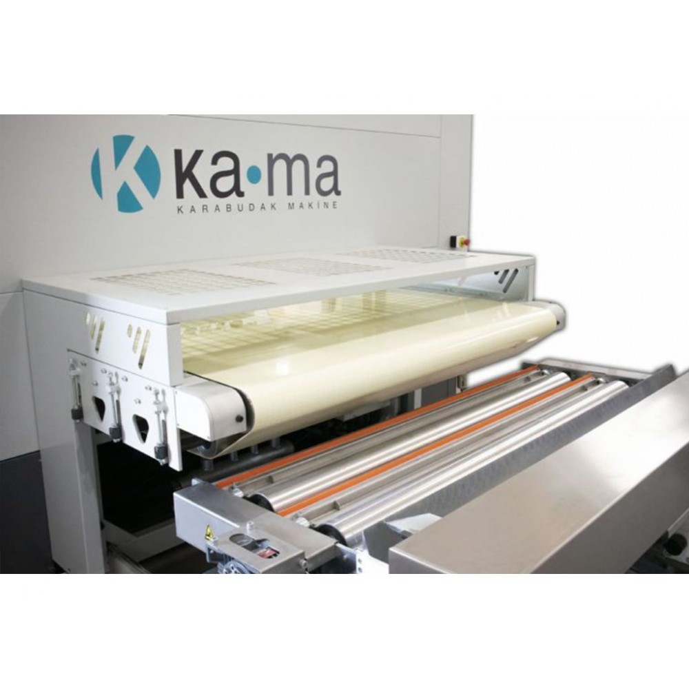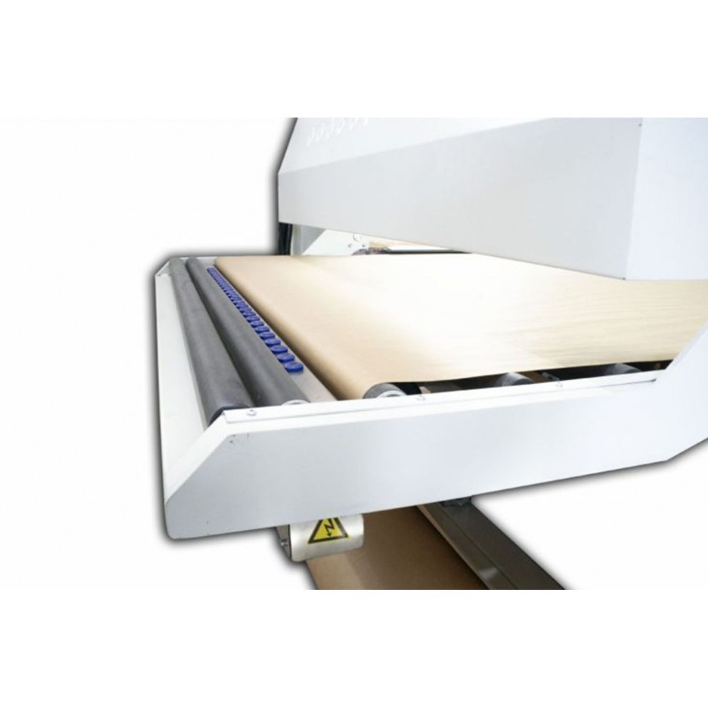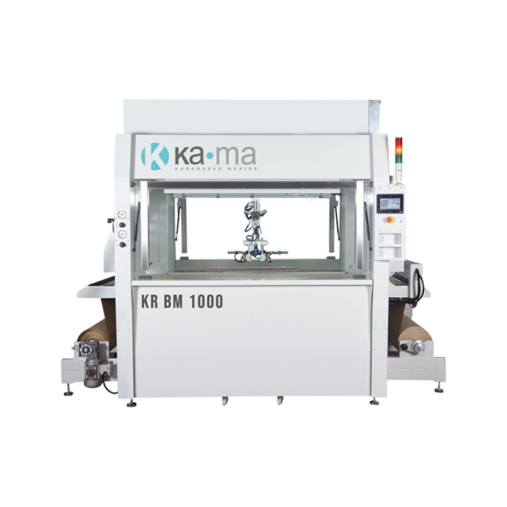 KR BM 1000-K фарбує вироби на паперовій стрічці на стрічці вакуумного конвеєра. Паперова стрічка завжди натягнута, стійка і гладка (під час фарбування не мнеться) завдяки вакуумному конвеєру. Після процесу фарбування брудний папір вивільняється із системи завдяки механічному гальмуванню, при цьому легко намотується на рулон при виході з машини, завдяки системі намотування з регульованим крутним моментом.