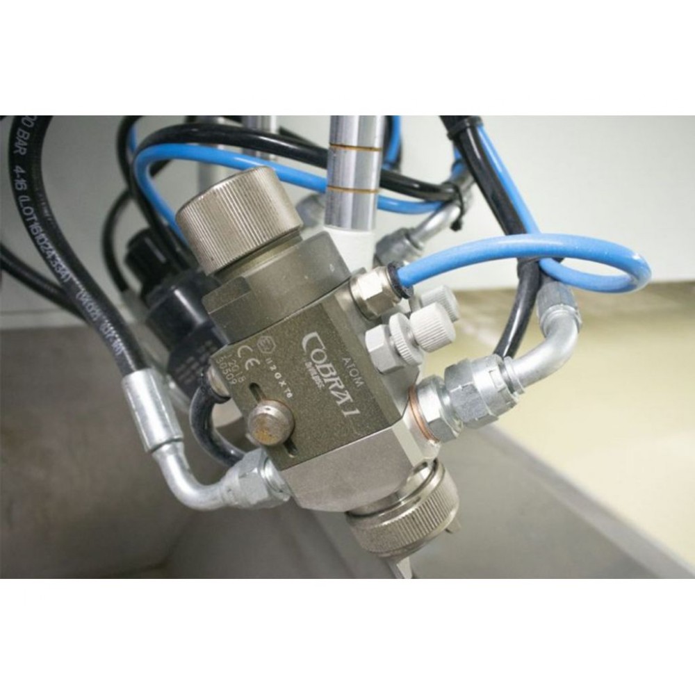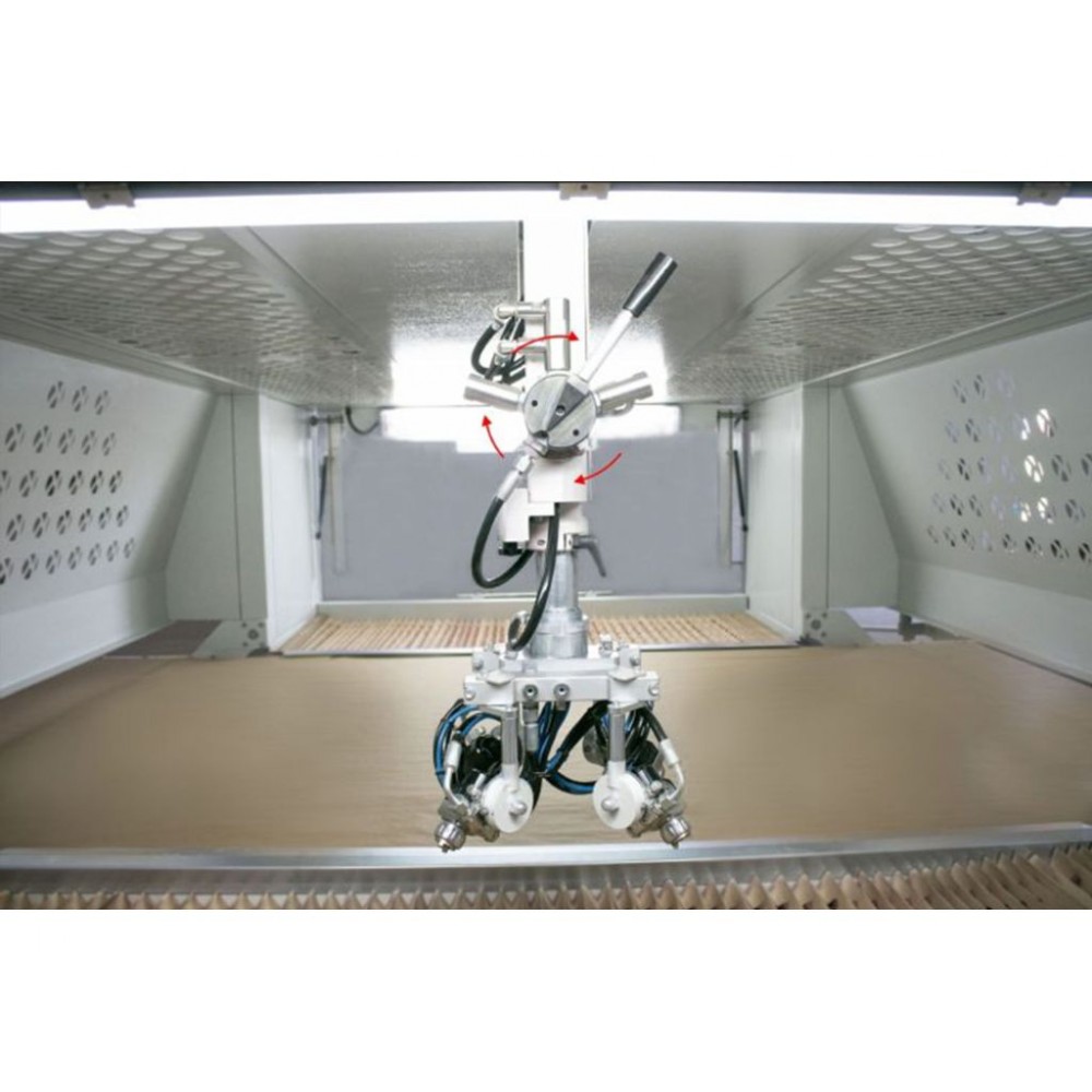 Машина має високорозвинену систему. Процес забарвлення здійснюється за допомогою робота-маніпулятора, розташованого в центрі і оснащеного 4-ма фарборозпилювачами високого тиску. Швидкість рукоятки, яку можна регулювати за допомогою панелі керування, при бажанні можна збільшити до 180 метрів за хвилину. Фарборозпилювачі легко змінюються, а кут і висоту можна регулювати завдяки зручному дизайну. Розпилюваний матеріал ділиться на мікрони і наноситься на продукт з потрібною швидкістю і тиском завдяки насосу для розпилення фарби високого тиску.