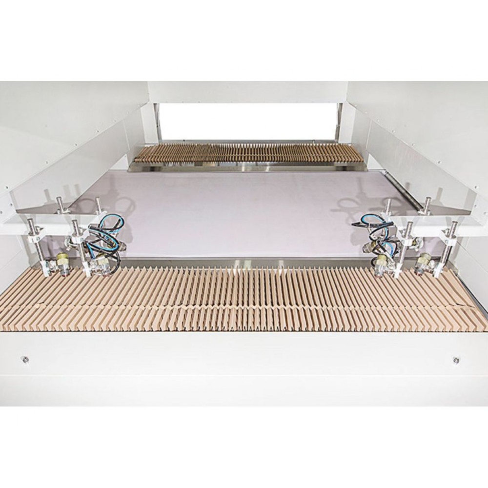 Продукція безпечно забарвлюється по обидва боки за допомогою системи очищення стрічки в машині для фарбування дерева KR BM 1700. Виріб ніколи не стосується брудної стрічки. В системі очищення стрічка, яка набагато економічніша, ніж її аналоги, за 8 годин роботи забруднюється всього 12 літрів розчинника.