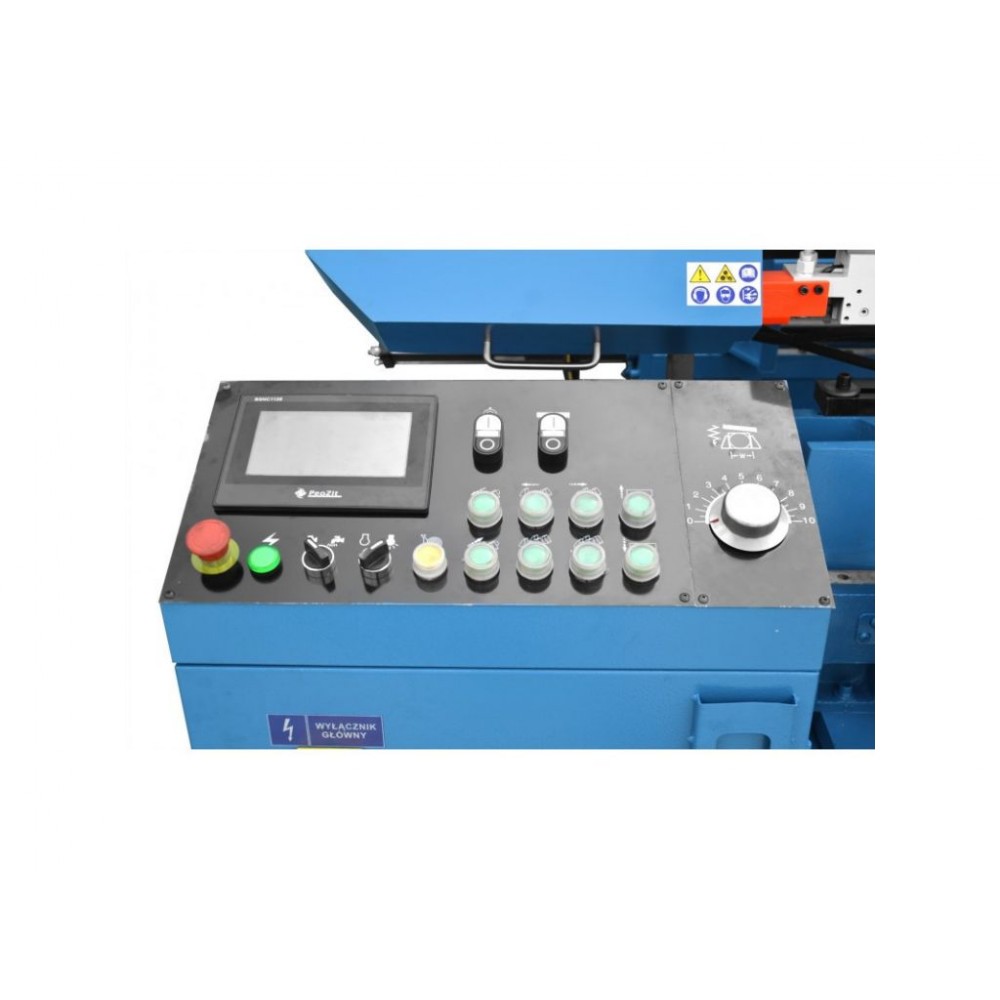 Система швидкої подачі дозволяє скоротити час різання окремих елементів. Гідравлічна система подачі матеріалу забезпечує повністю автоматичний цикл машини. Контролер, оснащений ЖК-дисплеєм на ПОЛЬСЬКІЙ мові, забезпечує просте програмування, управління пилкою, сигналізує про закінчення матеріалу, повідомляє про помилки та кількість відрізків після запрограмованого часу.