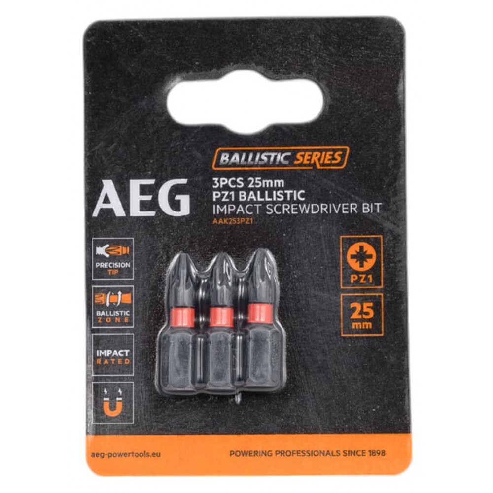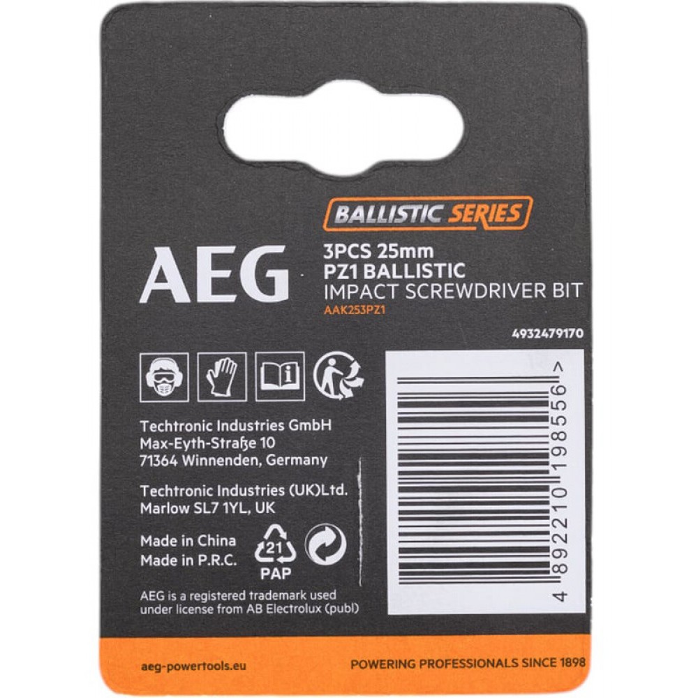 AEG (4932479170) - набір ударних біт, призначених для встановлення на викрутки та шурупокрути. Аксесуари постачаються в кількості 3 шт., відрізняються довжиною 25 мм. Приєднуються за допомогою хвостовика на 1/4 дюйми, мають наконечники хрестоподібного формату Pozidriv. В якості основного матеріалу в процесі виготовлення використовується хром-молібденова сталь, що пройшла антикорозійну обробку.