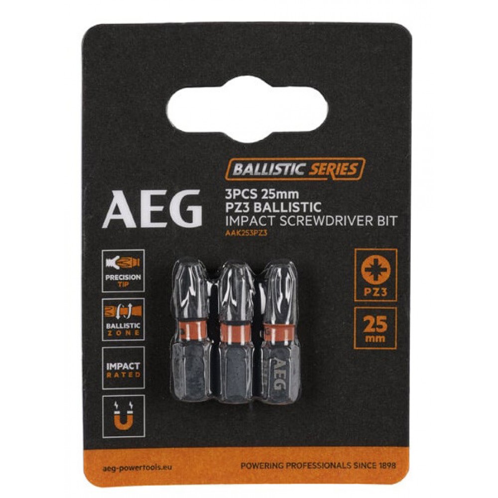 Представлений набір від німецького бренду AEG включає біти, призначені для роботи з ударними інструментами. Вони поставляються в наборі з 3 штук, мають довжину 25 мм, оснащуються хвостовиком на 1/4 дюйми для підключення. Наявність зони обертання дозволяє знижувати передачу зусиль, забезпечуючи підвищену стійкість до поломок. В якості основного матеріалу при виготовленні використовується хром-молібденова сталь.