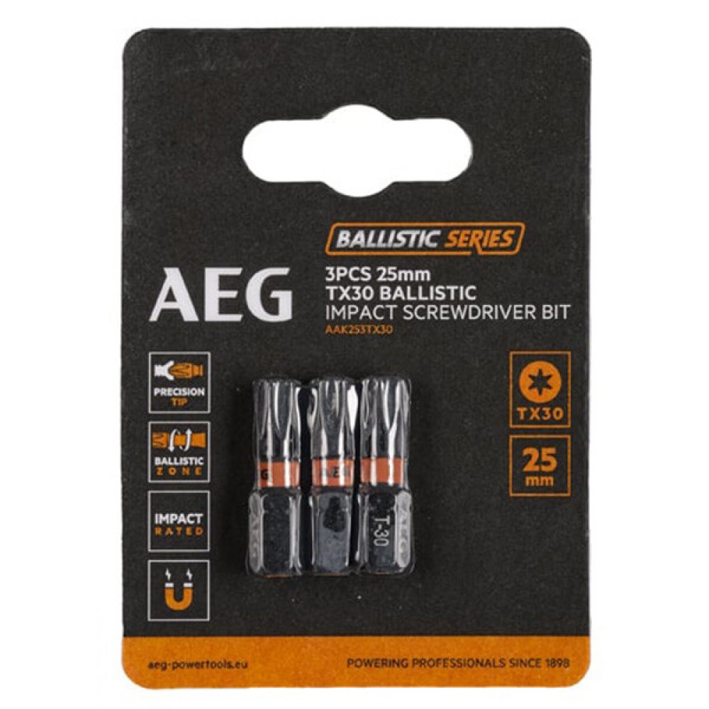 AEG (4932479176) - спеціальні біти, що поставляються в наборі з 3 штук. Вони виконані із загартованої хром-молібденової сталі, що не допускає появи корозії, характеризуються довжиною 25 мм та типорозміром наконечника ТХ30. Аксесуари встановлюються на викрутки та дрилі, що працюють в ударному режимі, можуть використовуватись у професійному та побутовому секторі.