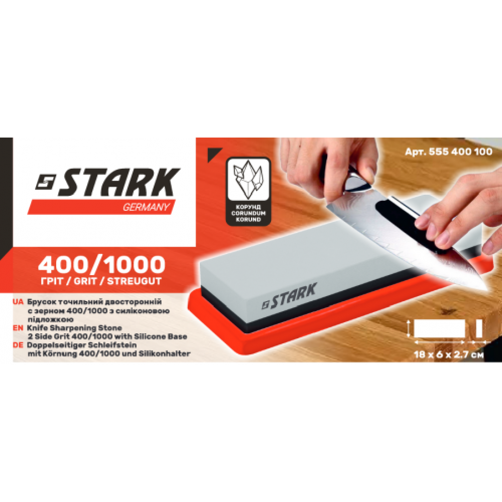 STARK 400/1000 – брусок для заточування кухонних ножів, ножиць, садового інструменту та інших лез. Інструмент призначений для використання на кухні, в майстерні, на дачі та в гаражі.