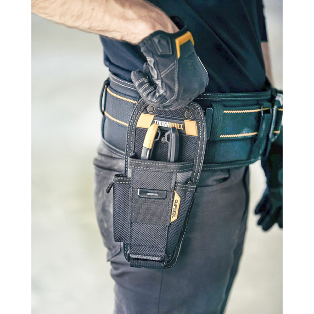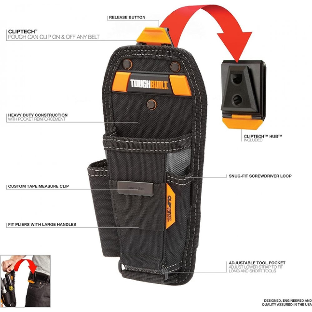 ToughBuilt (TB-CT-35-L) - робоча сумка для перенесення губцевого інструменту. Її можна носити окремо або чіпляти до ременя, вона виконана у вигляді мішечка з дном та центральною кишенею. Зручне розташування всередині забезпечують 4 кишені та петлі, нижній ремінець регулюється по висоті. Міцність і надійність сумки забезпечує якісний поліестер, що не промокає, який використовується при виготовленні.