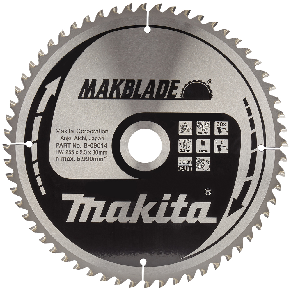 Товщина ріжучого полотна 1.8 мм у поєднанні із загальною товщиною диска 2.3 мм забезпечує оптимальний баланс між міцністю та мінімізацією втрат матеріалу. Це гарантує не тільки довговічність самого диска, а й знижує навантаження на пиляльний інструмент. Посадковий діаметр 30 мм робить диск пиляльний по деревині MAKBlade 255x30 60T, B-09014 сумісним з широким спектром професійних циркулярних пил та торцювальних пил, що робить його універсальним вибором для майстерень та будівельних майданчиків. Висока допустима швидкість обертання до 5999 об/хв підкреслює надійність та безпеку диска навіть при роботі на максимальних режимах.
