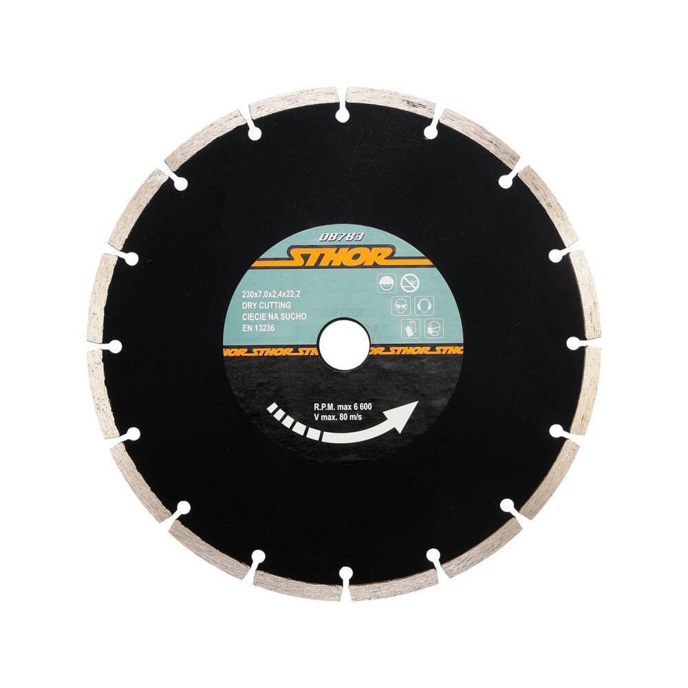 Диск алмазний для кутових шліфувальних машин. Оснащений сегментами висотою 7 мм та товщиною 2,4 мм Призначений для "сухої" роботи. Рекомендовано для різання кераміки, бетону, каменю, цегли. Рекомендована частота обертання приблизно 6600/хв