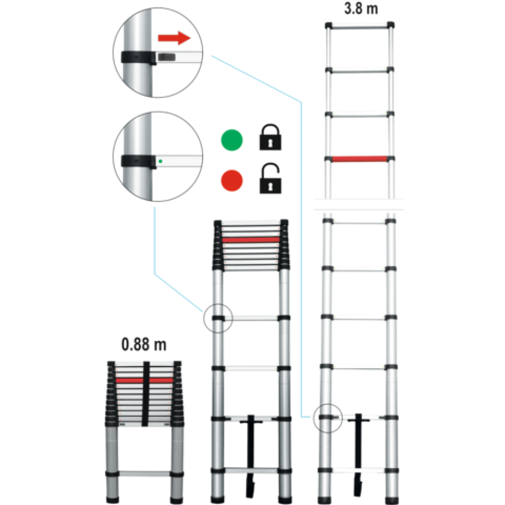 Драбина розтяжна телескопічна VOREL, 13 сходин, h=3.8 м, макс. вага- 150 кг, з алюмінію