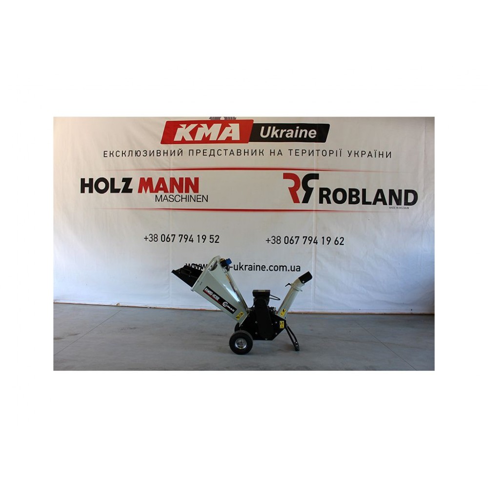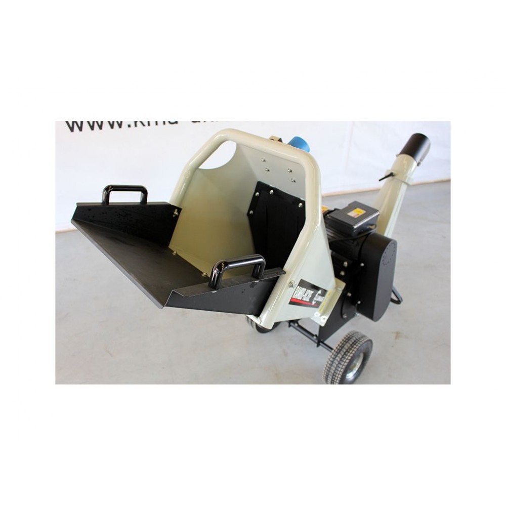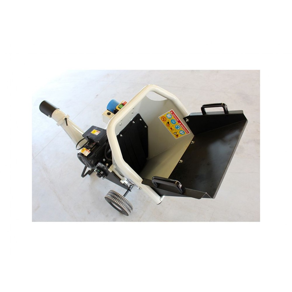 Довгий бункер з великою горловиною дозволяє легко і безпечно завантажувати сировину, а функція автоматичного затягування спрощує подачу матеріалу і виключає ризик зворотного удару. Труба для викиду подрібненого матеріалу повертається в різні сторони, що забезпечує вивантаження у потрібному місці (наприклад, на причіп). Для легкого транспортування цей електроподрібнювач гілок має інтегроване шасі.