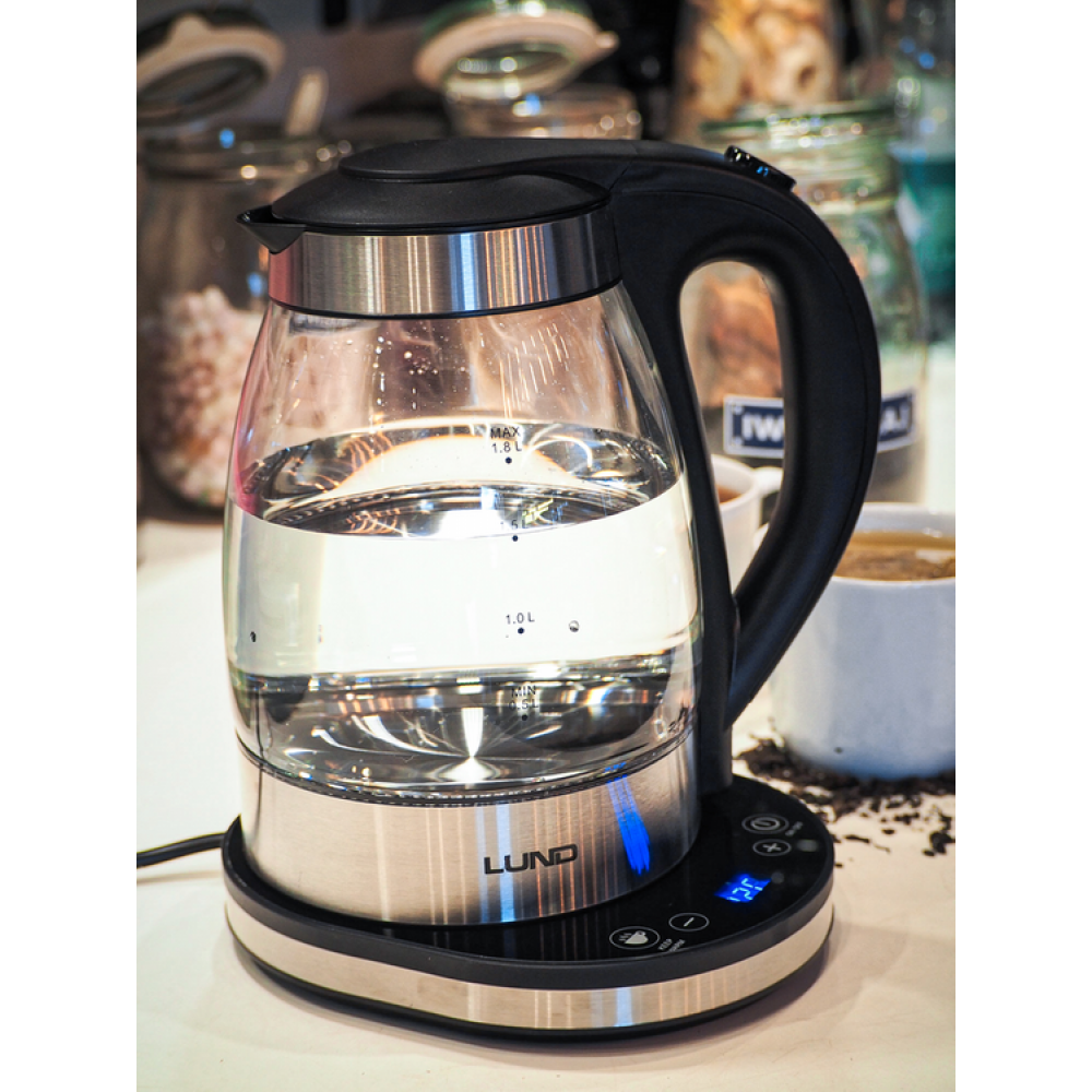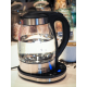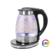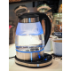 Скляний електричний чайник із функцією налаштування температури та внутрішнім світлодіодним кільцем , яке підсвічується синім кольором, коли вода закипає.