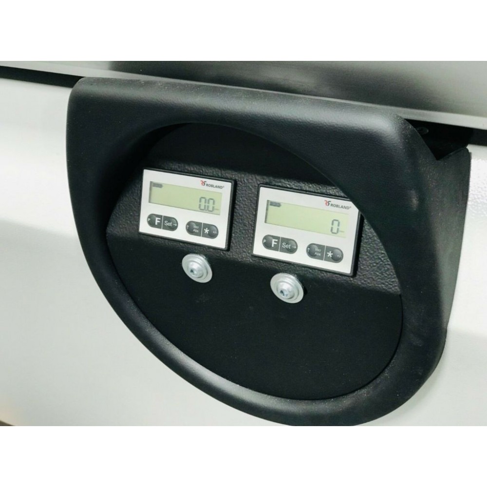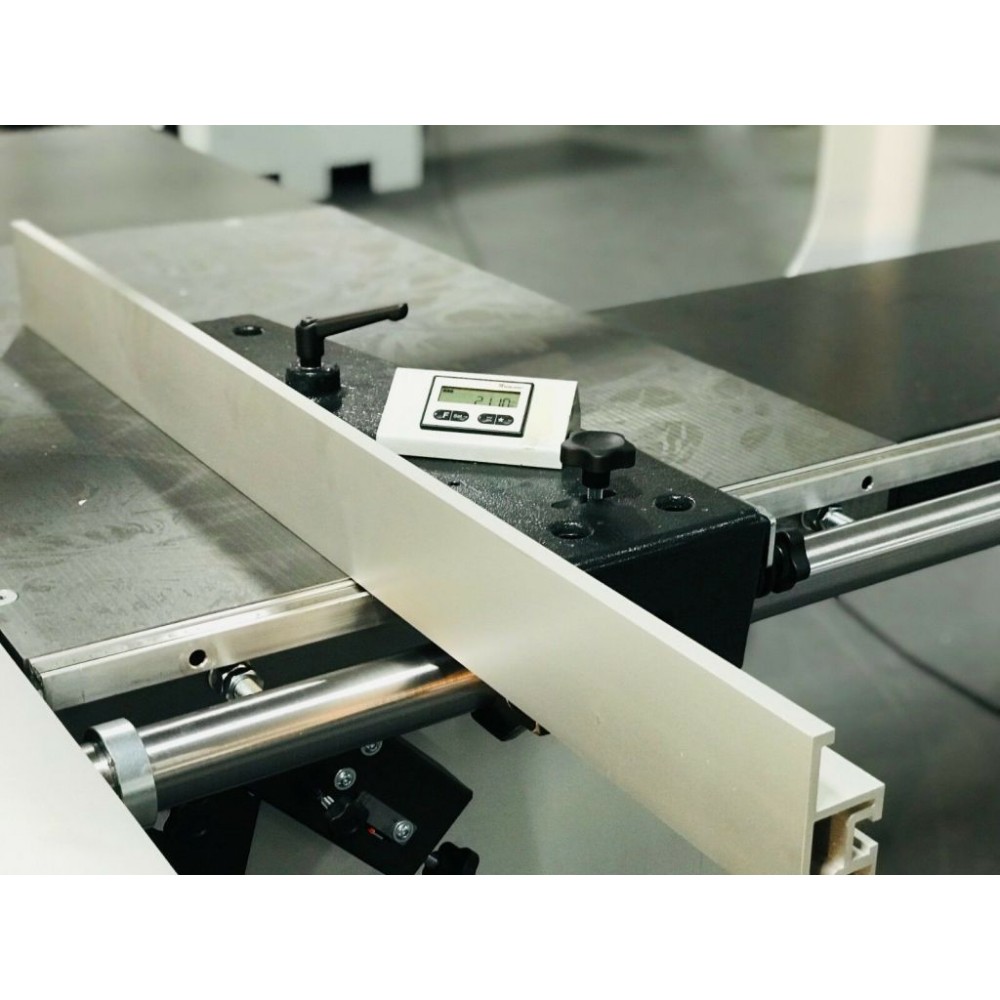 - Два цифрових індикатора розмірів на лівій поперечній лінійці (в комплекті подвійний відкидний упор DDF та одинарний на телескопічній лінійці)