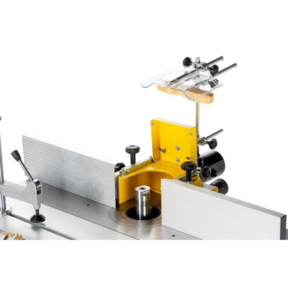 Комплект поставки: вбудований упор, алюмінієва шипорізна каретка, притискний пристрій, консоль з кутовим упором, захисний кожух фрезерного шпинделя.