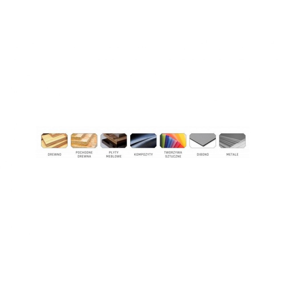Деревина будь-яких порід, плитні матеріали на деревній основі (ДСП, ДВП, МДФ, фанера тощо), композитні матеріали ("Alucobond", "Dibond", будь-які полістироли (зокрема ПВХ і полістироли з полікарбонатом), гетинакс, штучний камінь, кольоровий метал, акрилове скло та оргскло, модельний пластик тощо.