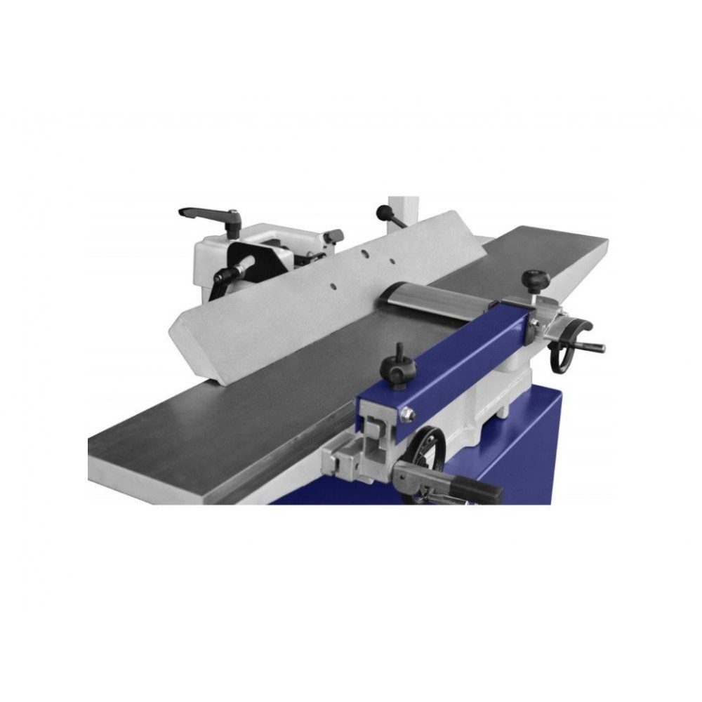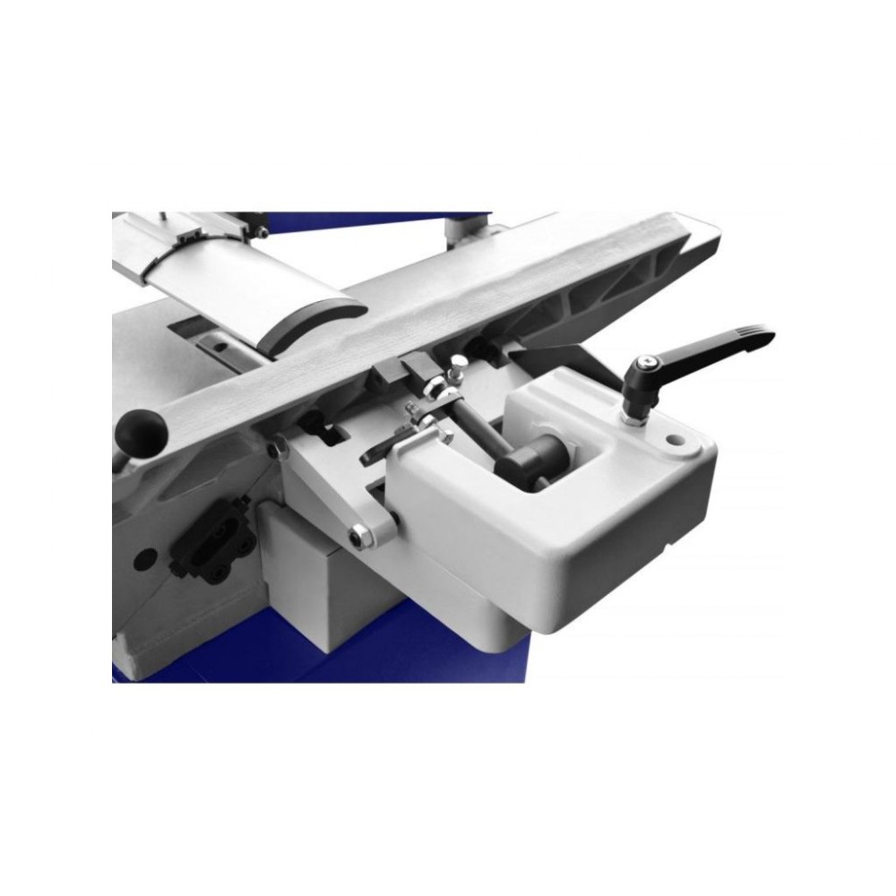Столи виготовлені з високоякісного чавуну і мають відшліфовану поверхню, що забезпечує площинність і легке ковзання заготовок. Вбудовані у столи шумопоглинаючі елементи мінімізують рівень шуму. Для максимальної безпеки оператора захисний кожух вала регулюється по висоті, куту та глибині накриття, а кнопка аварійної зупинки розміщена на кронштейні для швидкого доступу. Цей верстат для вирівнювання дощок також обладнаний поворотним на 0-45° упором, що дозволяє виконувати обробку під кутом.