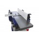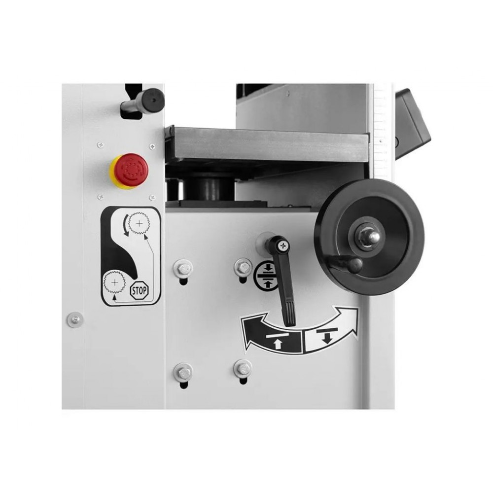 Особливістю моделі є можливість з’єднання та одночасного регулювання столів, що економить робочий час і підвищує точність обробки до 30%. Столи виготовлені з литого чавуну і мають шліфовану поверхню для легкого ковзання заготовок. Для високоточної кутової обробки використовується алюмінієвий маятниковий упор з кутом нахилу 90-45°. Цей рейсмусово фугувальний верстат 250 мм поєднує компактність і промислову потужність, тому буде ідеальним вибором для професійних майстерень з обмеженою робочою площею.