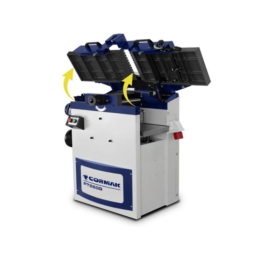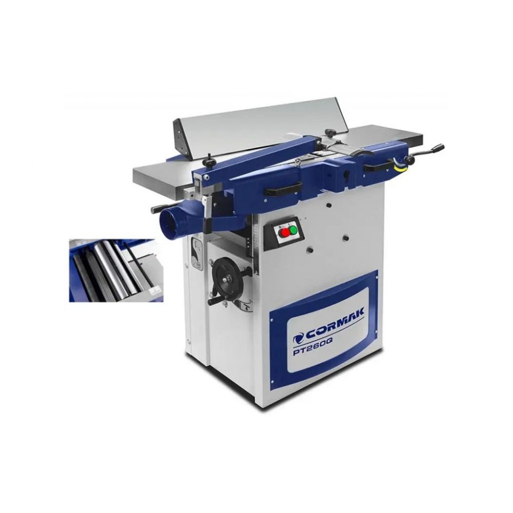 Фугувально-рейсмусовий верстат CORMAK PT260Q 400V - це комбіноване обладнання для вирівнювання поверхонь і калібрування деревини, ширина обробки якого становить 250 мм. Жорстка чавунна конструкція у поєднанні з трифазним асинхронним двигуном потужністю 2,2 кВт/ 2,6 кВт гарантують високу точність обробки та ефективну роботу з твердими породами дерева. 3-ножовий стругальний вал діаметром 75 мм обертається зі швидкістю 4000 об/хв, забезпечуючи гладкість обробленої поверхні.