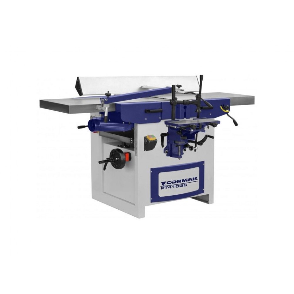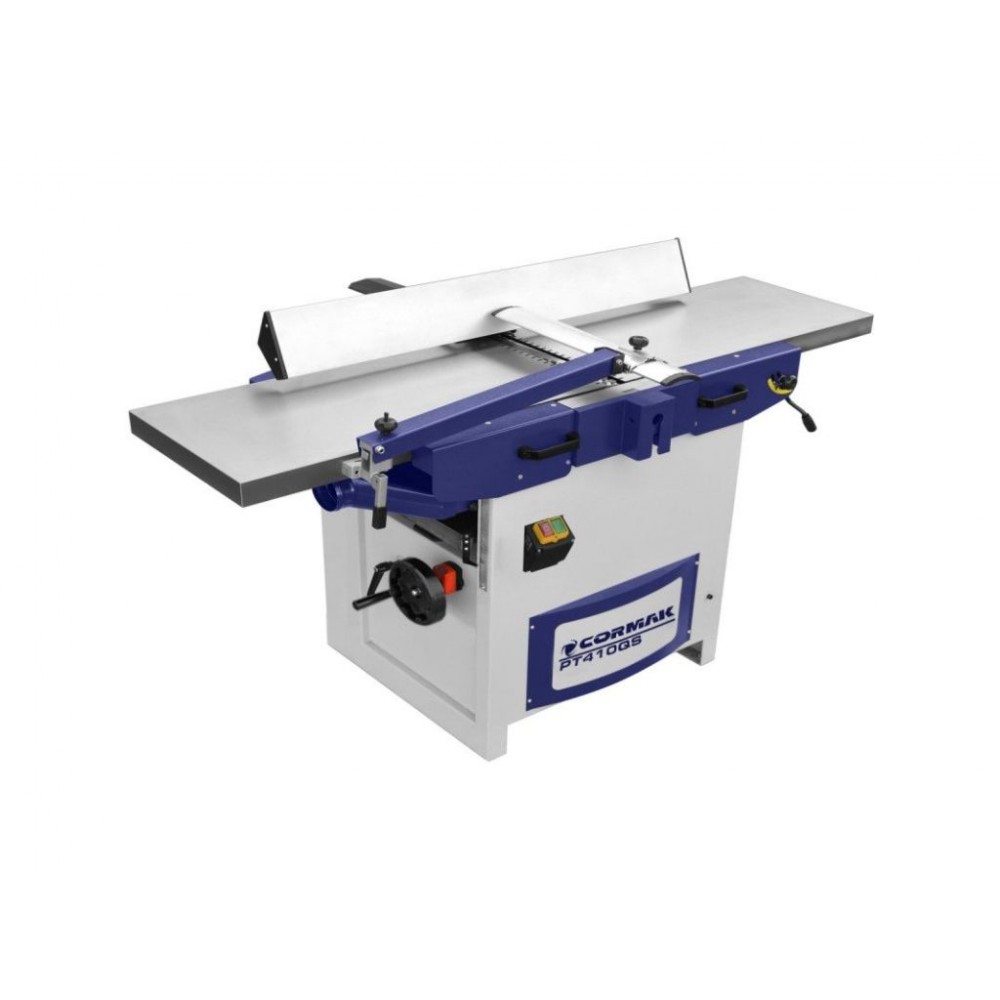 Фугувально-рейсмусовий верстат зі спіральним валом CORMAK PT410QS - це професійне обладнання промислового класу, яке забезпечує точну і якісну обробку всіх порід деревини. Трифазний двигун потужністю 3 кВт відмінно справляється з інтенсивними навантаженнями, а спіральний вал Ø95 мм зі швидкістю обертання 4300 об/хв забезпечує гладку та рівну поверхню навіть при роботі з твердим і смолистим деревом. Ширина обробки - 410 мм, глибина зняття за прохід - 4 мм фуганок, 3,5 мм рейсмус. Максимальна висота заготовки - 220 мм.