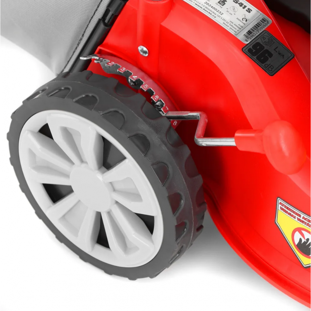 Бензинова газонокосарка HECHT 541 S оснащена 4-тактним двигуном об'ємом 79,8 см³, що розвиває потужність 1,5 кВт/2 к.с. і працює на швидкості 3000 об/хв. Завдяки ширині зрізу 41 см і колісному приводові вона забезпечує комфортне та ефективне косіння, ідеально підходить для ділянок площею до 700 м².