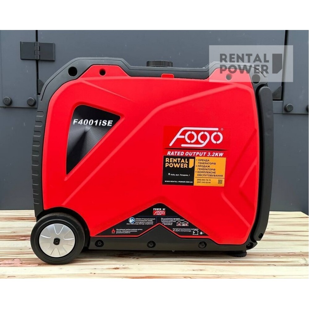 Інверторний бензиновий генератор FOGO F4001iSE – оснащений надійним, стійким до роботи в екстремальних умовах 4-х тактним двигуном марки Rato R 210 D-Vi з максимальною потужністю на виході до 3.5 кВт. Ідеальний варіант, щоб зробити ваш відпочинок, похід чи риболовлю ще яскравішим та комфортнішим. Під час роботи повного бака палива об'ємом 8.3 л вистачить до 8 годин при 50% навантаженні. Інверторна технологія забезпечує надійне живлення для чутливих електричних приладів та комп'ютерів. Захист при низькому рівні мастила. Зручна захищена панель.