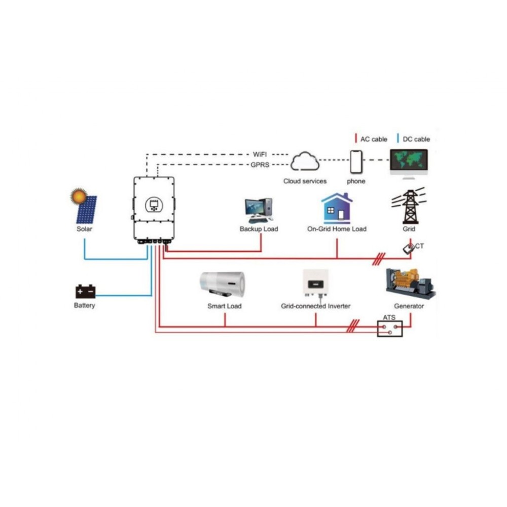 Цей інвертор підтримує підключення будь-якого низьковольтного акумулятора і комплектується трансформаторами, датчиком температури, монтажним набором і Wi-Fi. Він не потребує встановлення Smart Meter і автоматично перемикається на аварійне живлення за 0,4 секунди. Інвертор DEYE V-TAC має постійне навантаження на одну фазу 5 кВт. Він сумісний з додатками DEYE і SOLARMAN для зручного моніторингу та управління.