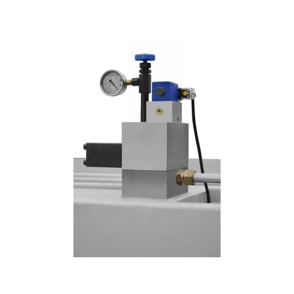 - Завдяки тандемній системі синхронізації гідравлічних циліндрів забезпечується рівномірність зусилля різання. За допомогою регулювання об'єму масла може бути налаштований кут різання для розрізання листів різної товщини.