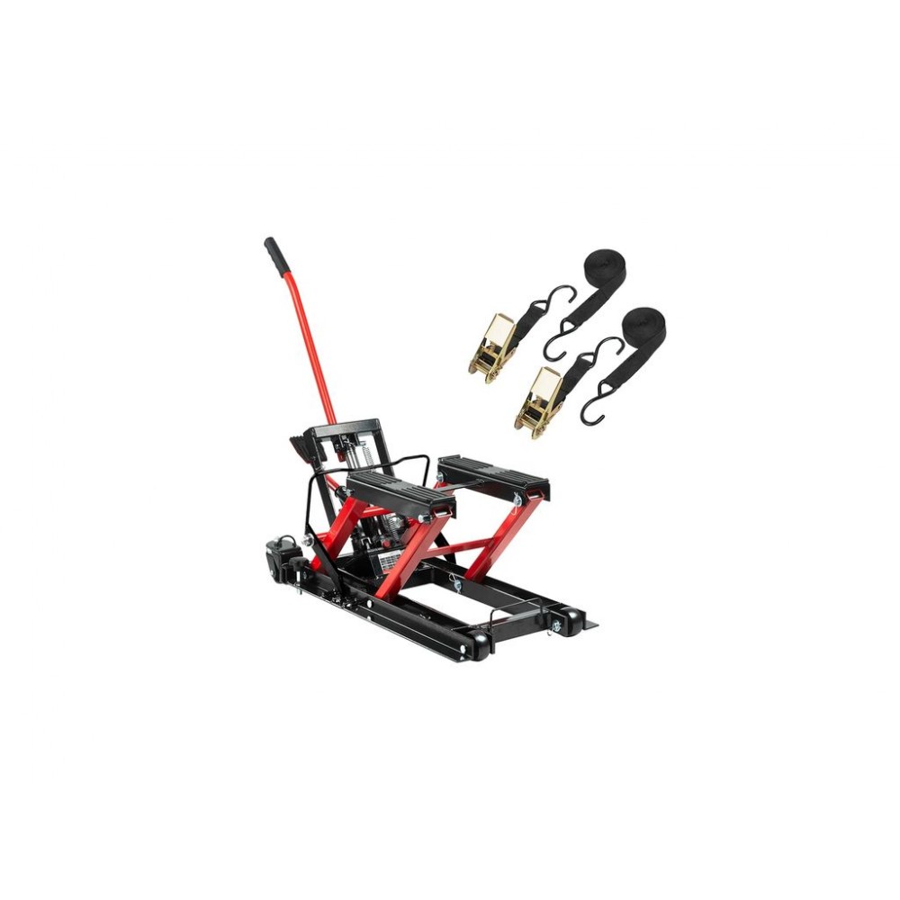 Гідравлічний підйомник для мотоциклів та квадроциклів + ремені безпеки REDATS LS-570 з вантажопідйомністю 680 кг і діапазоном підйому 120-385 мм відмінно підходить для обслуговування мотоциклів, квадроциклів, скутерів і подібних транспортних засобів як у власному гаражі, так і в автосервісах. Оснащений надійним гідравлічним механізмом, який забезпечує плавність і контрольованість підйому та опускання. Керування підйомом і опусканням виконується за допомогою педалі.