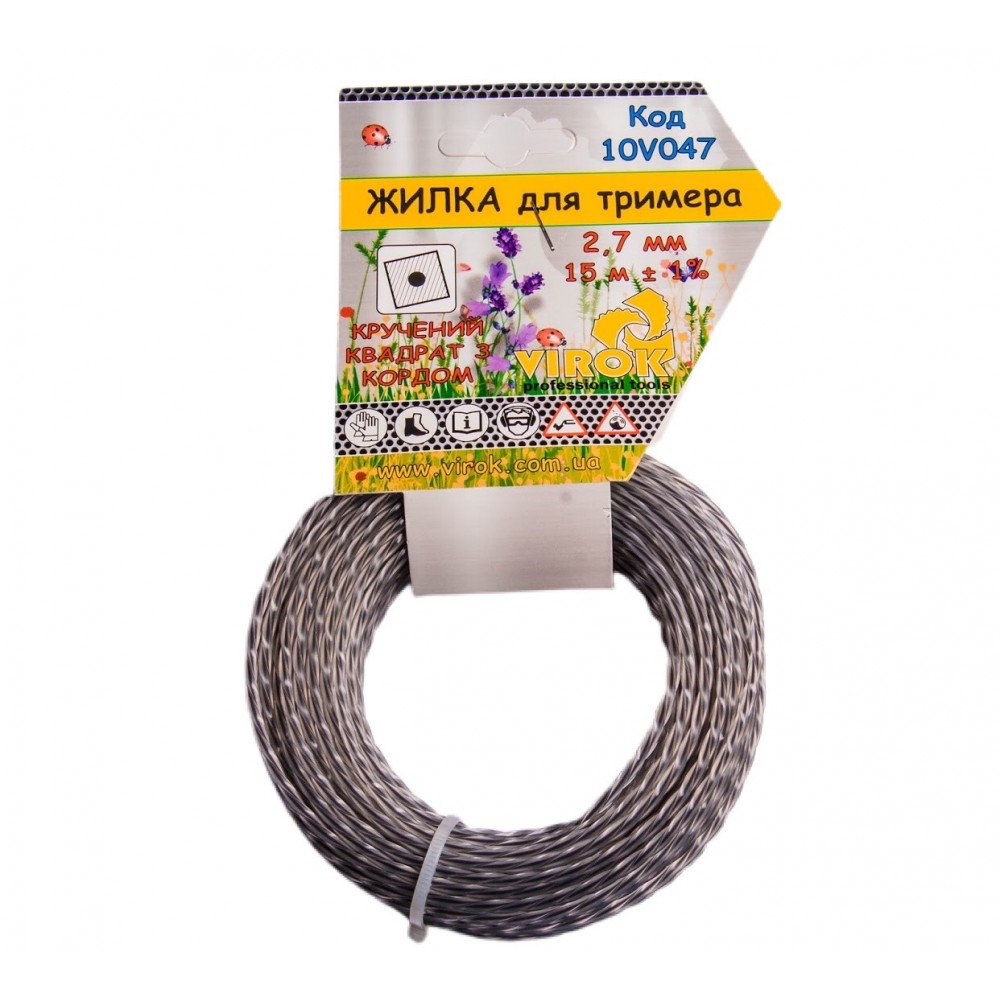 Поліамідна армована жилка змотана в моток. Діаметр жилки 2,7 мм, довжина 15 м, переріз - кручений квадрат. Використовується для скошування трави і бур'яну.