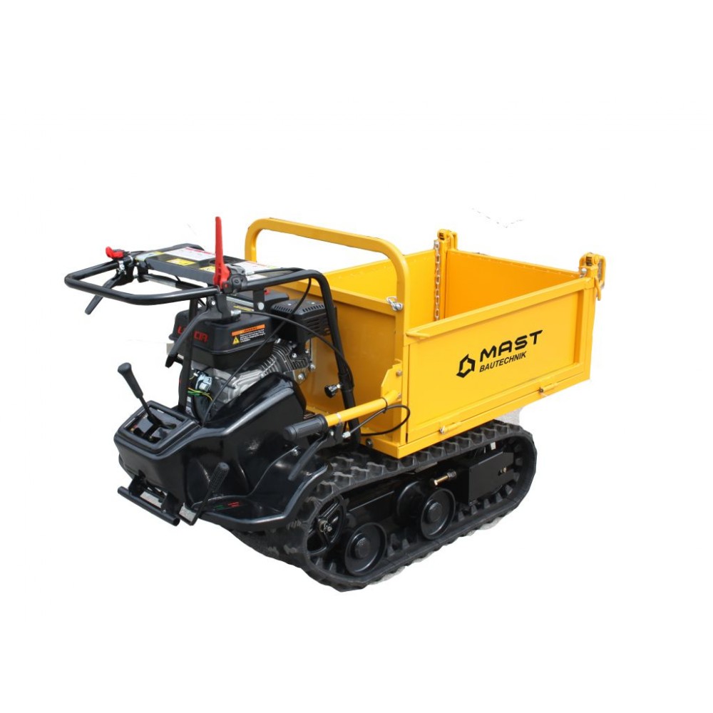 Максимальна вантажопідйомність моделі становить 350 кг. Кузов має розмір 850х570х290 мм (ДхШхВ) і виготовлений зі сталі з антикорозійним покриттям. Перекидання кузова виконується вручну. Максимальний кут нахилу кузова - 60°. Самоскид-думпер гусеничний MAST Bautechnik MT-MD350 має просте важільне управління і легкий в експлуатації.