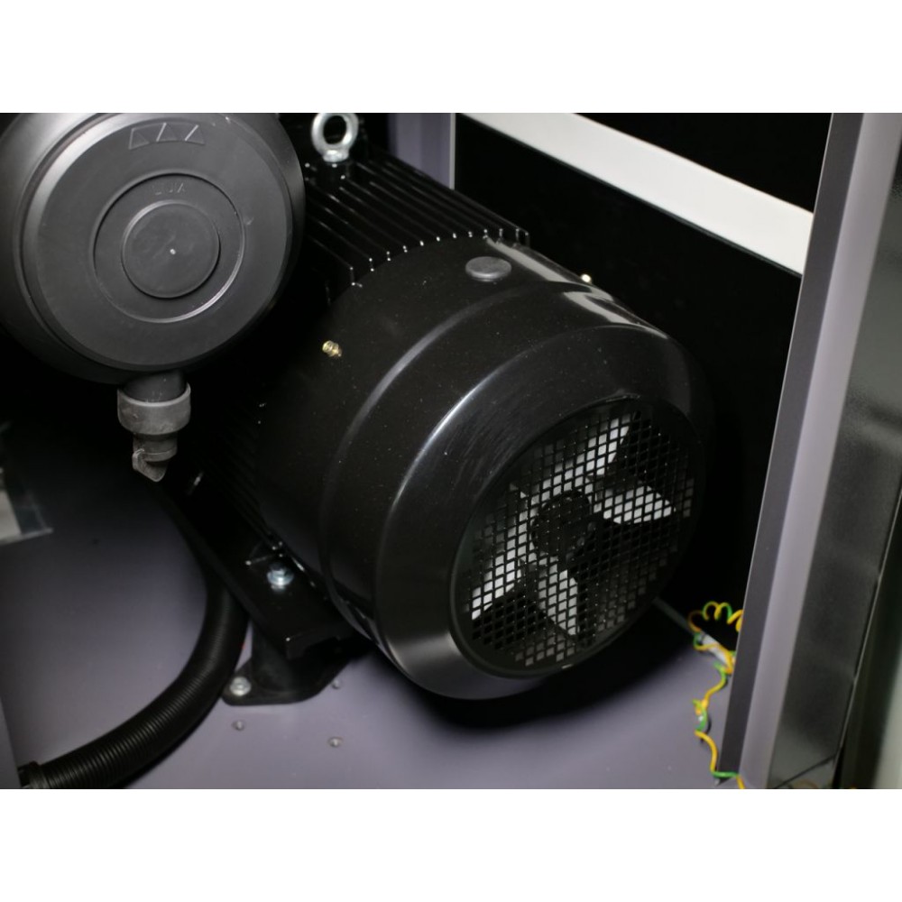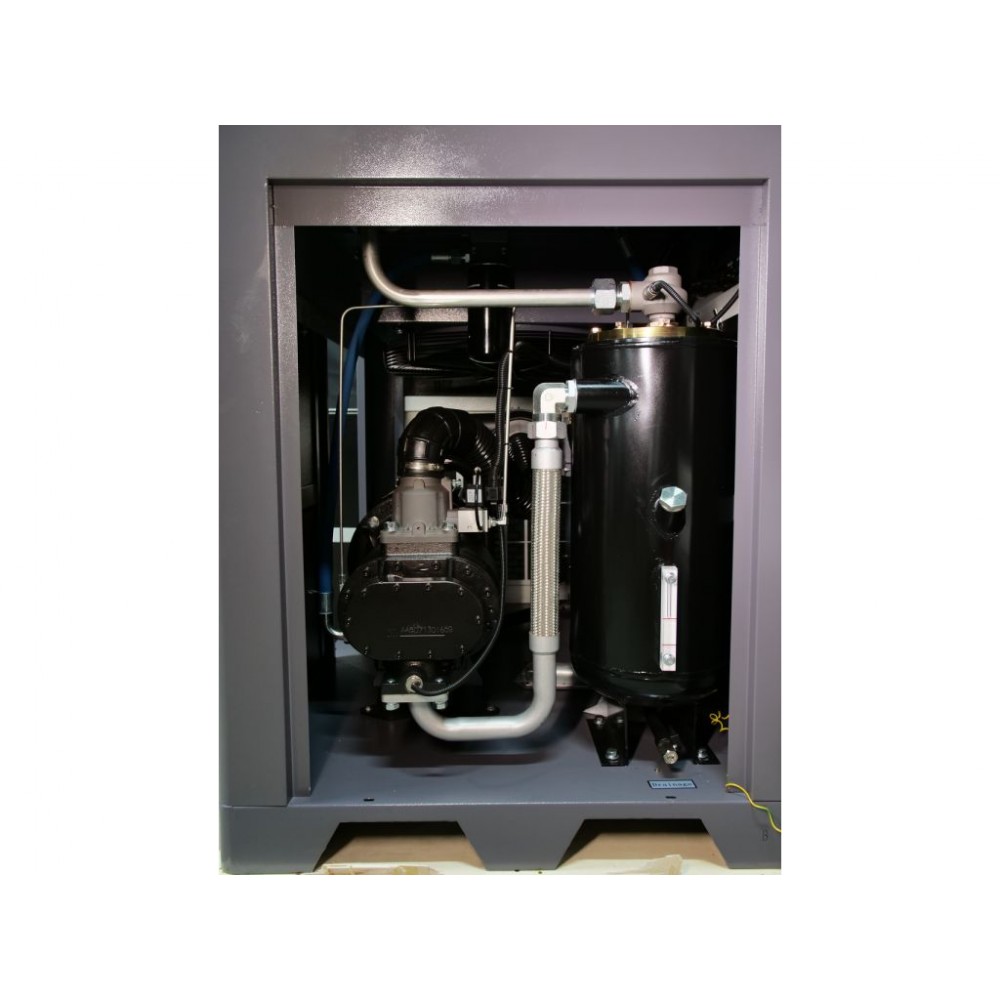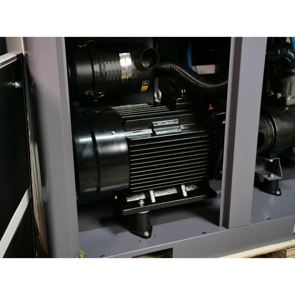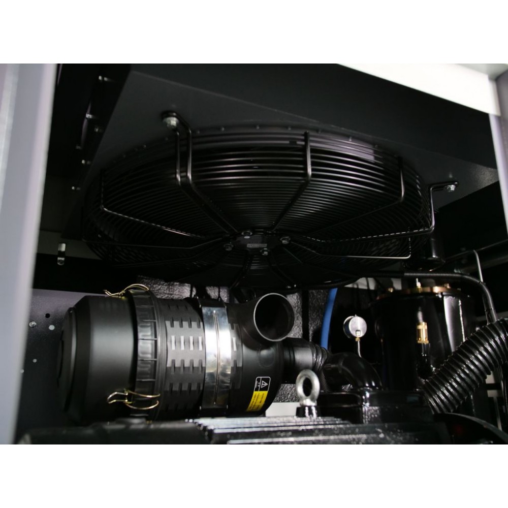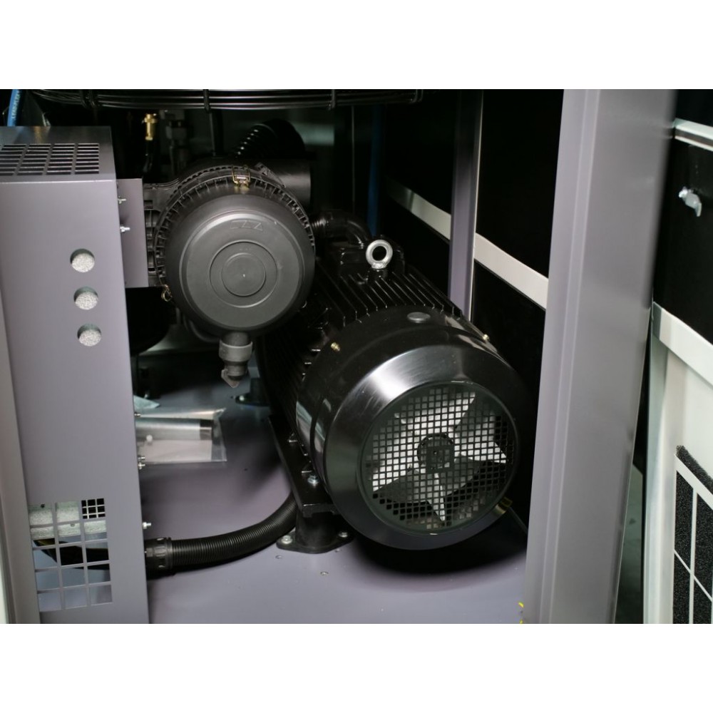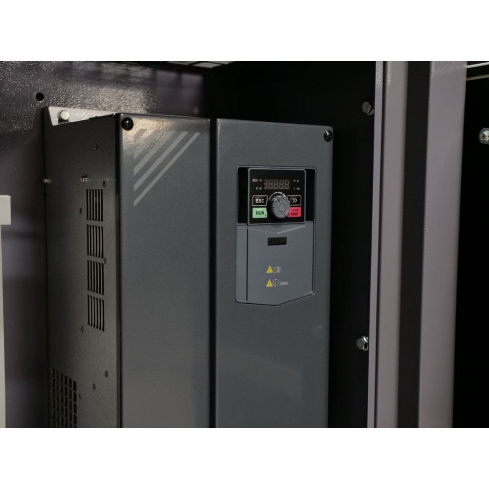 Корпус виготовлений зі стійкої до корозії і скручування товстостінної сталі і має знімні панелі для легкого доступу до внутрішніх компонентів. Завдяки якісній шумоізоляції компресор працює дуже тихо (рівень шуму - 70±2 дБ(А)), що дозволяє встановлення у виробничому приміщенні без дискомфорту для персоналу. Також цей інверторний компресор для виробництва оснащений модулем Wi-Fi, завдяки якому можна віддалено відстежувати параметри його роботи через спеціальний додаток.