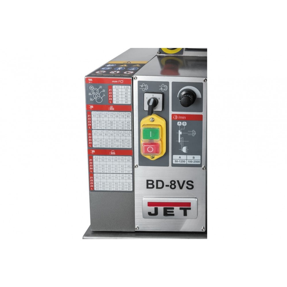 Верстат JET BD-8VS – відноситься до класу настільних токарних верстатів. Верстат поставляється з піддоном для збирання стружки і через піддон прикручується до тумби, або верстата. Незважаючи на свої маленькі габарити, верстат здатний обробляти заготівлю діаметром до 210 мм над станиною, а якщо точити над супортом, цей діаметр зменшується до 135 мм. При цьому максимальна довжина обробки (РМЦ) становить 400 мм.