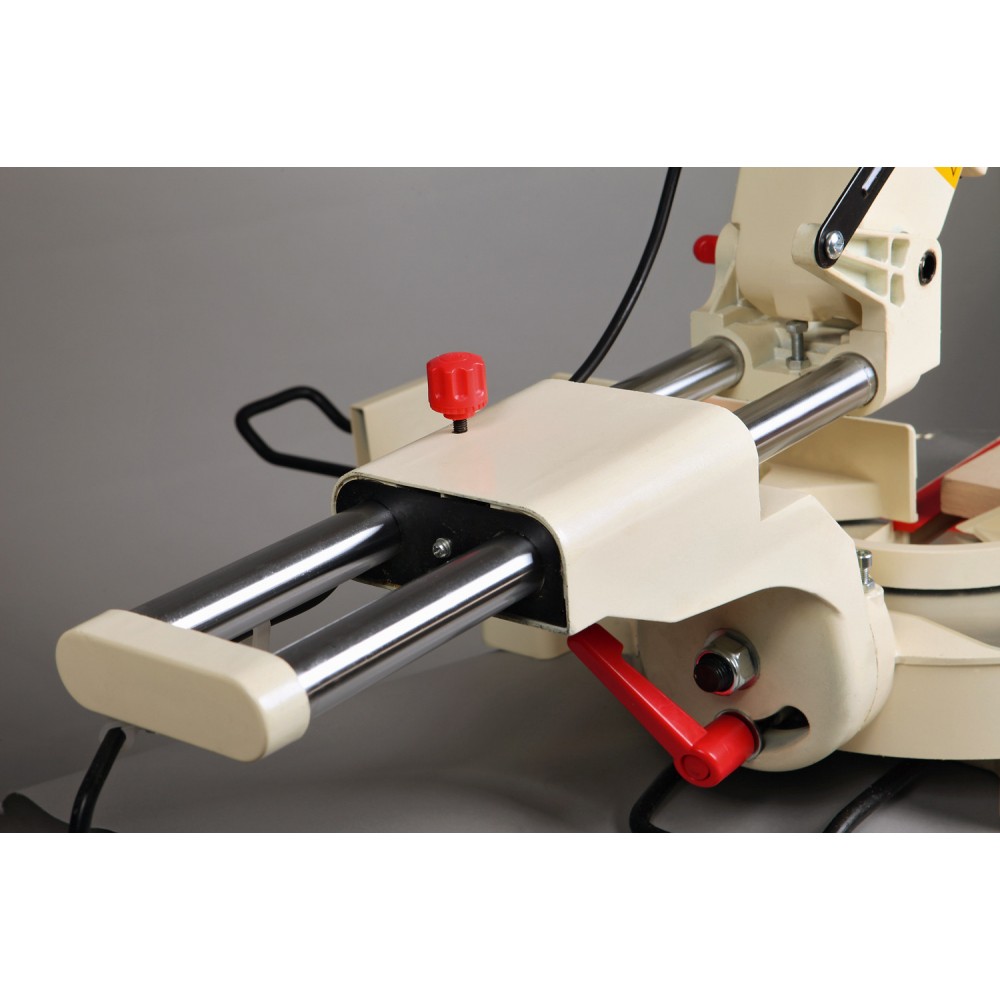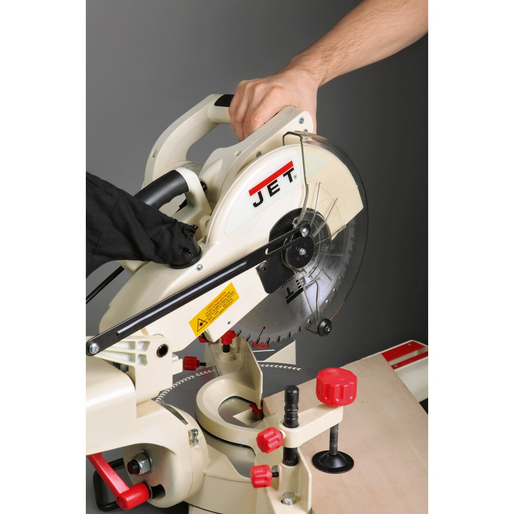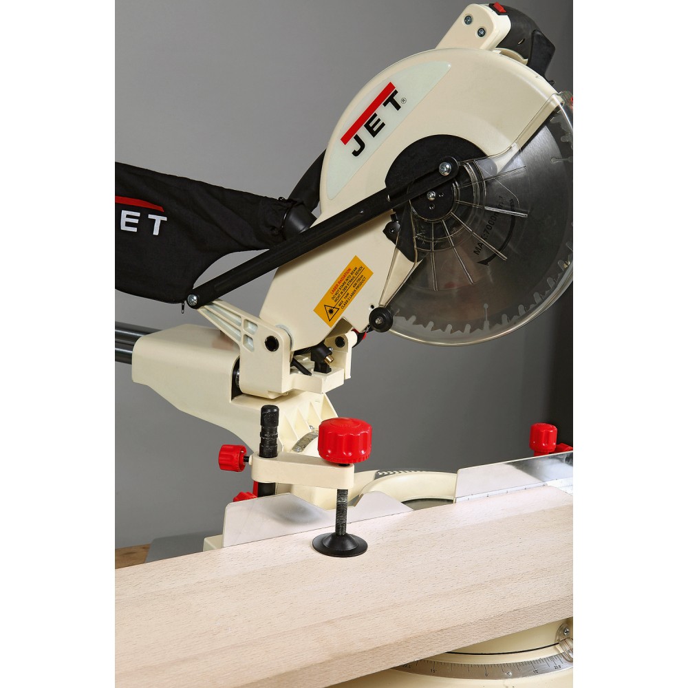 Торцовочно-усовочная пила Jet JSMS-8L имеет все необходимые функции распиловки с поворотом / наклоном и в дополнение к этому оснащена механизмом протяжки. Он обеспечивает продольный ход пильной части, благодаря чему больше длина реза и, соответственно, ширина распиливаемых за один проход деталей (она достигает 305 мм). Кроме того, возможность протягивать пилу может быть использована для нарезки шипов с края заготовки (усовки) и для выполнении глухих пазов (глубину при этом ограничивают регулируемым упором).
