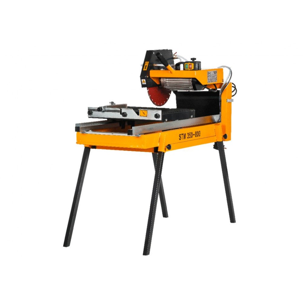 Каменерізний верстат Lumag STM 350-800 призначений для мокрого різання натурального і штучного каменю, керамічної плитки, бетону, мармуру, цегли і подібних матеріалів. Максимальна довжина різання - 800 мм, глибина пропилу - до 120 мм за один прохід. Також дана модель може різати під кутом 45° на глибину 80 мм. Оснащений надійним двигуном потужністю 2 кВт, який здійснює обертання ріжучого диска зі швидкістю 2800 об/хв. Живлення від напруги 230 В.