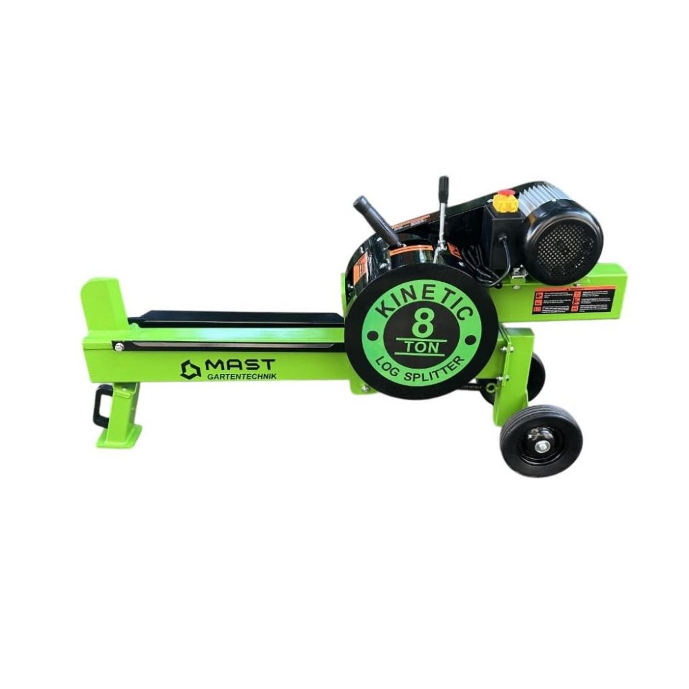 Кінетичний дровокол MAST Gartentechnik MT-PR-K8T з електродвигуном потужністю 2 кВт і зусиллям 8 тонн відмінно підходить для швидкої заготівлі дров у приватних господарствах. Розколювання здійснюється за допомогою маховика, який накопичує енергію і при опусканні важеля миттєво передає її на зубчасту рейку, яка штовхає поршень вперед. Завдяки цьому колода розколюється з високою швидкістю (швидкість подачі - 1 с, повернення - 1 с), що забезпечує високу продуктивність роботи.