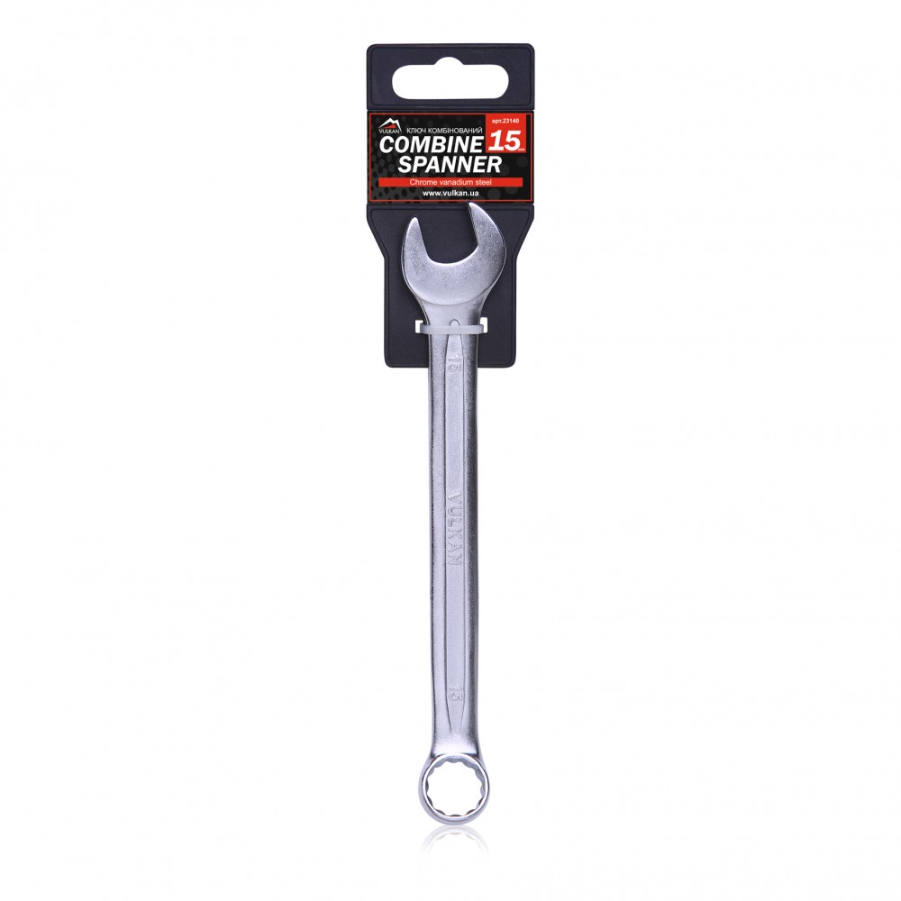 Комбінований ключ Vulkan на 15 мм виготовлений методом холодного штампування з хром-ванадієвого сталевого сплаву, який відрізняється високими показниками міцності. Крім того, основна робоча деталь ключа пройшла додаткове загартування, і її твердість складає 47 HRC.