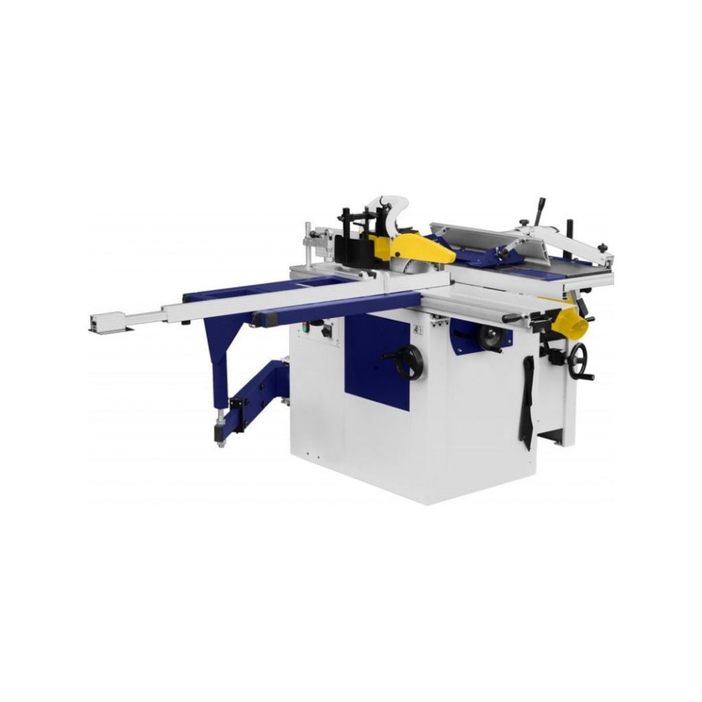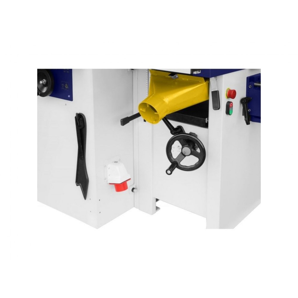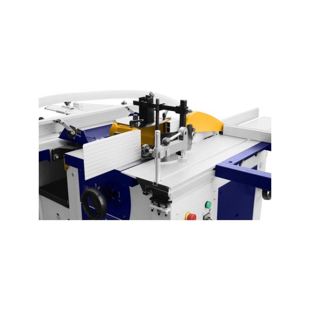 Прецизійний стругальний вал з 3 ножами зі швидкорізальної сталі та алюмінієва ковзаюча напрямна з трикутною напрямною гарантують високу точність операцій. Складані столи дають можливість швидко перейти від фуганка до рейсмуса. Пильний вузол можна встановити під кутом до 45° за допомогою маховика. Для безпеки оператора верстат обладнаний відкидною кришкою шпинделя та фугувальним упором з нахилом від 90° до 45°. Цей комбінований верстат по дереву оптимізує будь-яке деревообробне виробництво і підвищить його продуктивність.