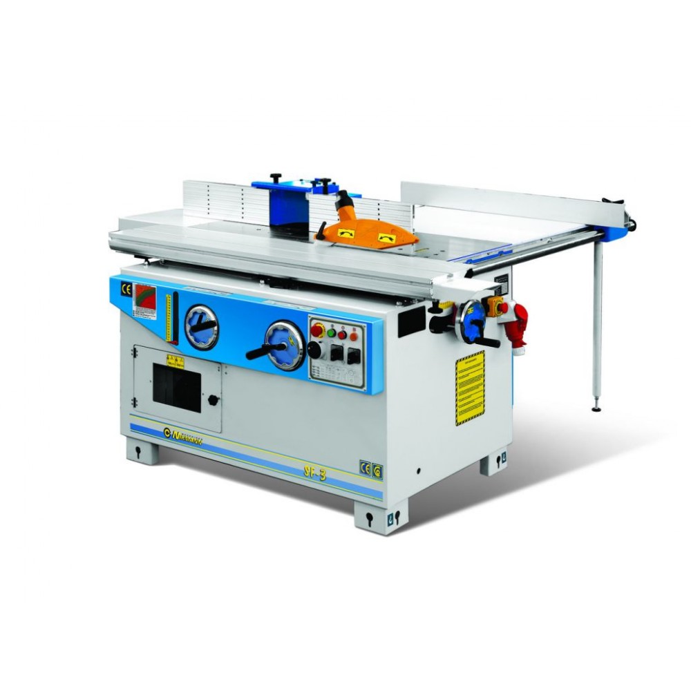 Форматний алюмінієвий стіл із загартованими сталевими напрямними. Телескопічна лінійка 1400 мм з двох повертаються упорів. Лінійка для паралельна різка з микрометрическая налаштування. Способу диска до 45° зі зчитування по шкалу. Діаметр отвору в столі o190 mm з аспіраційна патрубка під робочого столу. Фрезерний шпиндель не нахиляється. Запобіжник для фрези діаметром ø180 мм. Ширина пропилу з паралельною лінійкою 850 mm.