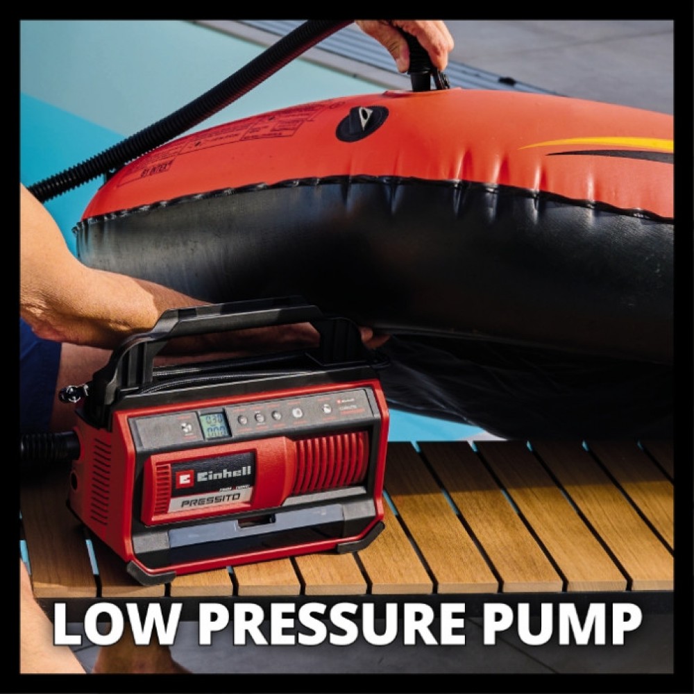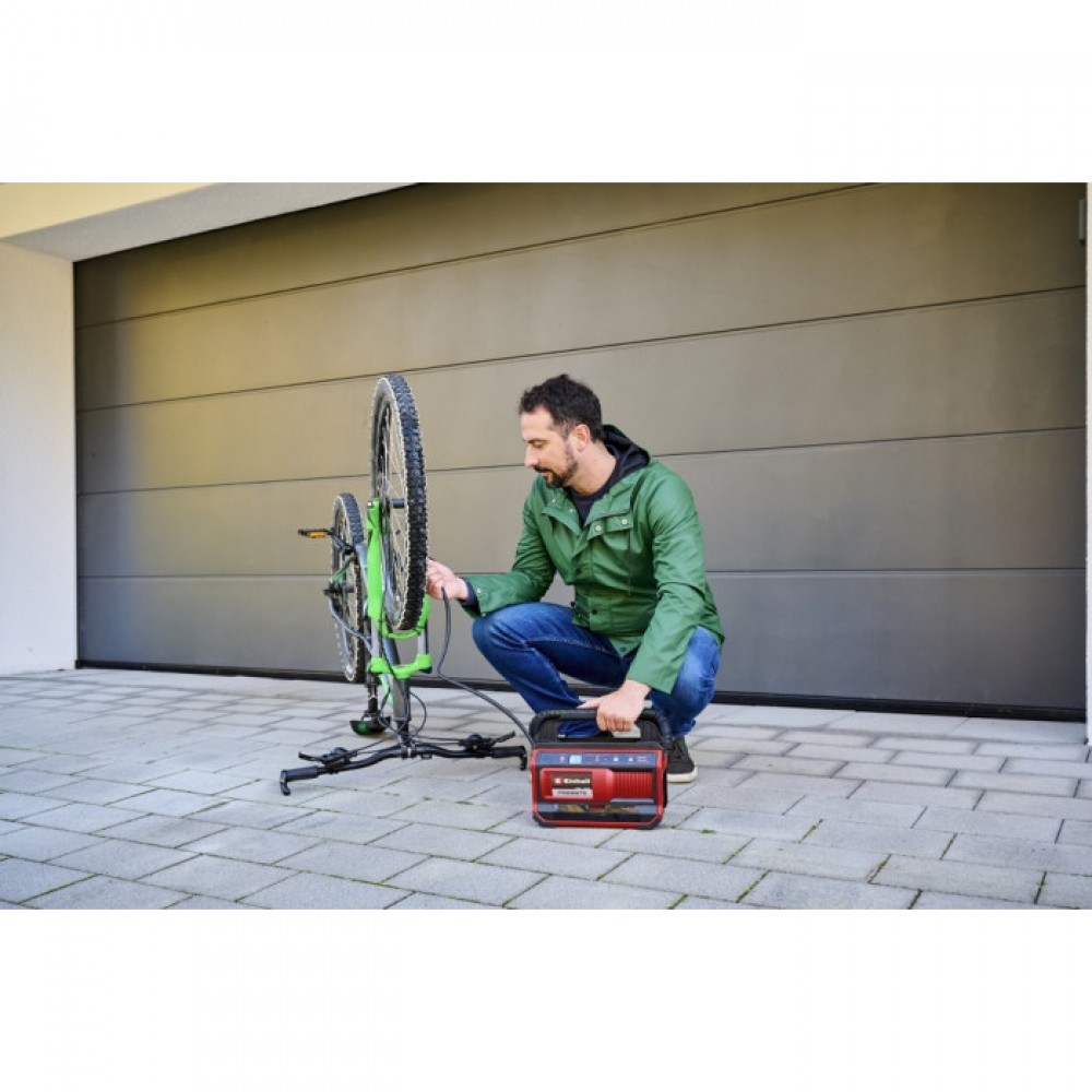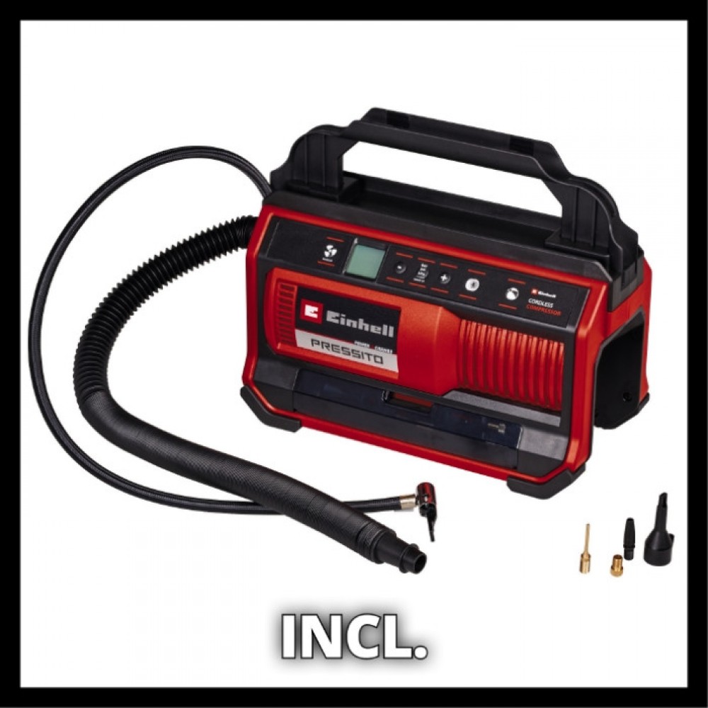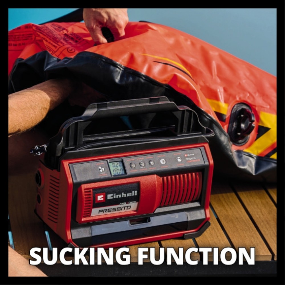 Компресор Einhell PRESSITO 18/25 є частиною сімейства Power X-Change і живиться від акумулятора 18 вольт. Завдяки насосу високого та низького тиску, а також опції всмоктування низького тиску та ручці для перенесення, компресор дуже зручний і функціональний у дорозі та вдома. Кнопковий перемикач дозволяє надувати (високий тиск) без попереднього налаштування тиску. Фактичний і цільовий тиск можна зчитати в барах, psi або кПа на LED дисплеї. При досягненні потрібного тиску насос автоматично вимикається. Набір із 3 адаптерів для шин, м’ячів тощо, а також шланги зберігаються у вбудованих відсіках. Поставляється без акумулятора і зарядного пристрою, вони доступні окремо.Інструмент серії Power X-ChangeПомпа високого тиску для надування колес авто і велосипедів, мячівПомпа низького тиску для надування матрасівВсмоктування низьким тиском для здування матрасівЕлектронний індикатор тискуНеобхідний тиск для насоса високого тиску регулюється до 11 барКнопка для накачування без попереднього встановлення тискуФункція автоматичного вимикання при досягнені потрібного тискуВідсік для зберігання насадок (3 шт у комплекті)Практична ручка для транспортуванняПоставляється БЕЗ акумулятора і зарядного пристрою