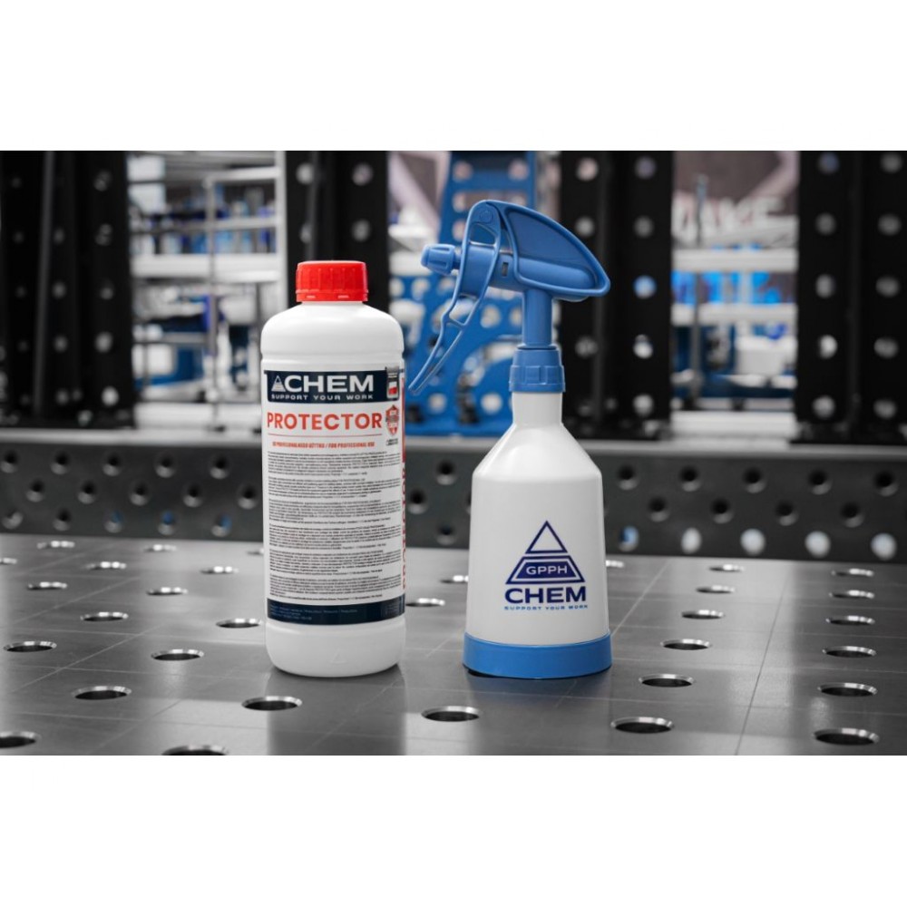 Водорозчинний, висококонцентрований та ефективний антиіскровий засіб для зварювальних столів, збагачений інгібіторами корозії. Цей базовий препарат захищає зварювальне обладнання, залишаючи на ньому спеціальний, міцний захисний шар. Завдяки ньому зварювальні столи залишаються без іскрових пошкоджень, що забезпечує більш точну, зручну та організовану роботу. Використання засобу PROTECTOR значною мірою захищає обладнання від наслідків експлуатації. Рідина не має запаху та не виділяє небезпечних для здоров'я летких речовин під час зварювання. Не містить олійних сполук, тому немає протипоказань для використання на матеріалах, які надалі підлягають фарбуванню або цинкуванню.