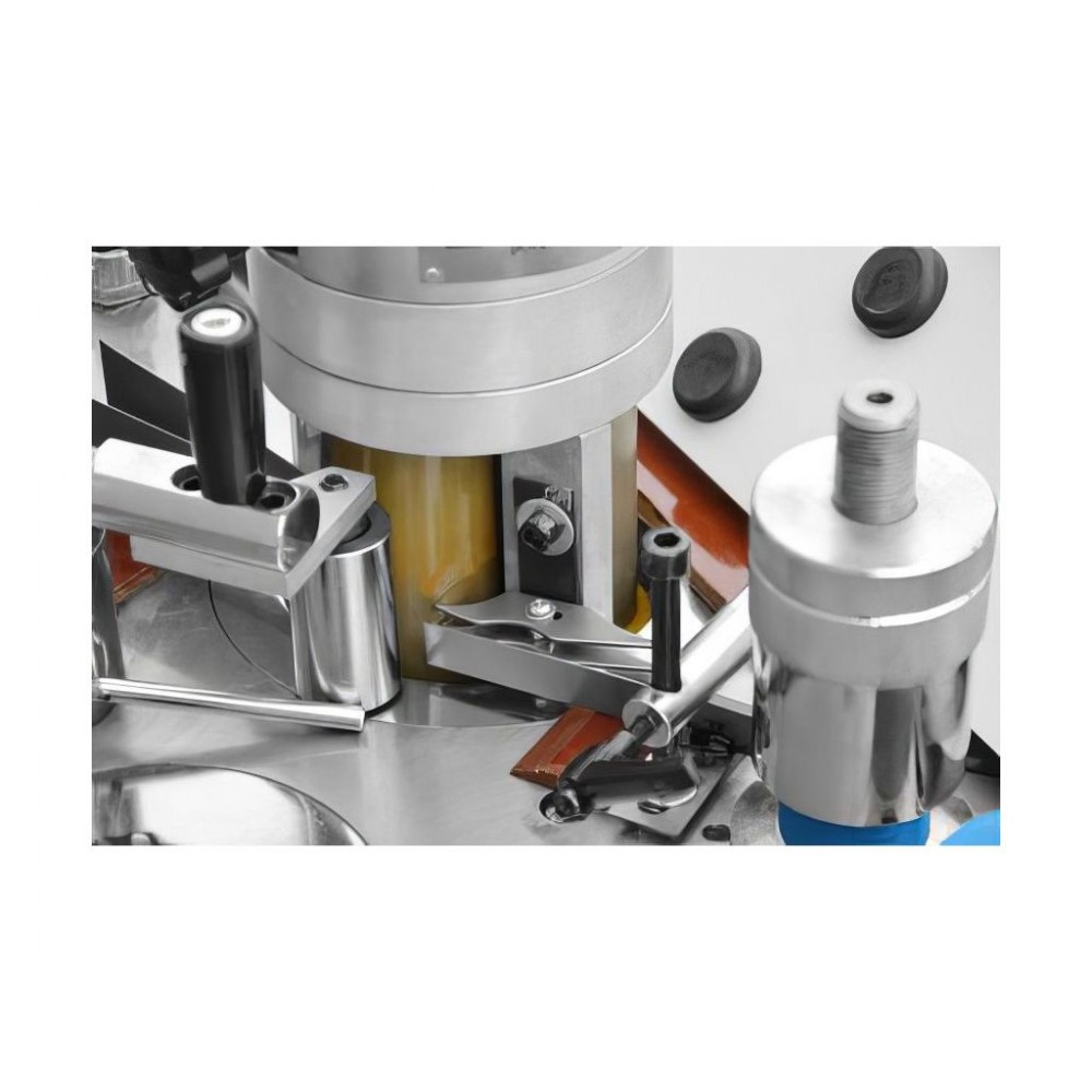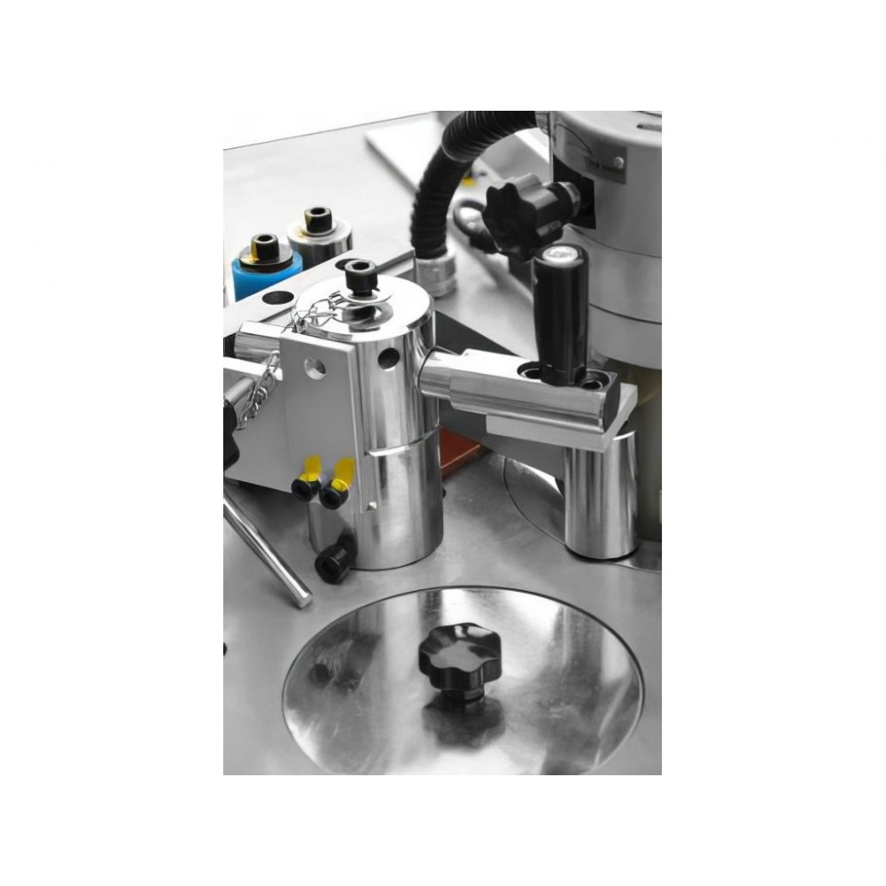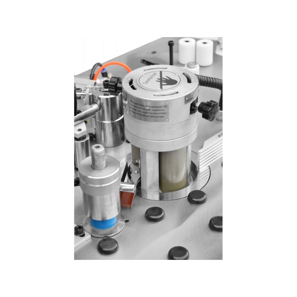 - онащений двома клеєнаносними валами: один вал призначений для нанесення клею розплаву на кромковий матеріал, інший вал для нанесення клею розплаву на край заготовки.