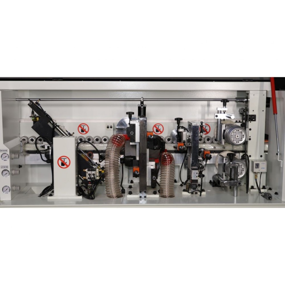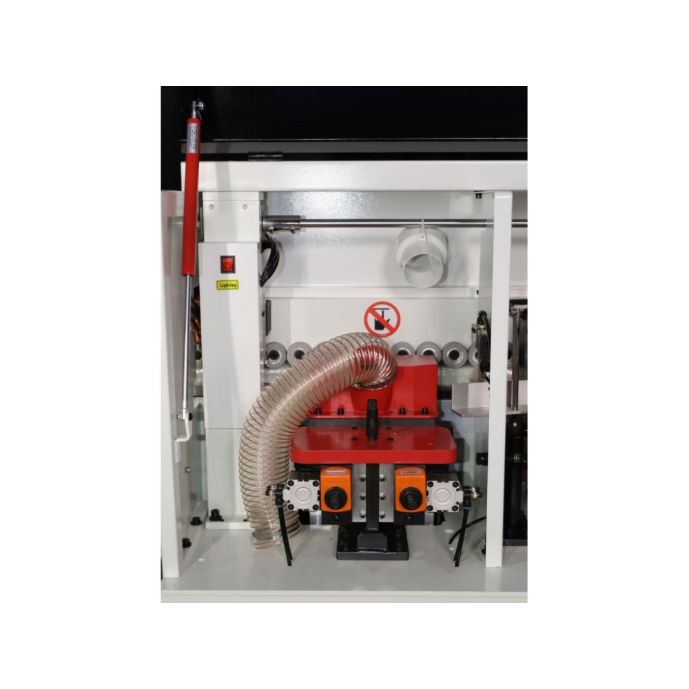 - Гумові притискні ролики, розташовані в 2 ряди, забезпечують надійну фіксацію і точне транспортування заготовок