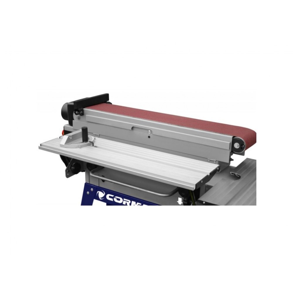 Трифазний двигун потужністю 1,1 кВт забезпечує стабільний і рівномірний рух стрічки зі швидкістю 840 м/хв. Регулювання кута шліфування від 0 до 45° дозволяє обробляти скошені і кутові кромки. Додатковий бічний стіл розміром 514x221 мм забезпечує точне ведення заготовок зі складними формами. Основний і додатковий столи регулюються по висоті, що дозволяє адаптувати цей верстат для шліфування кромок під конкретне завдання.
