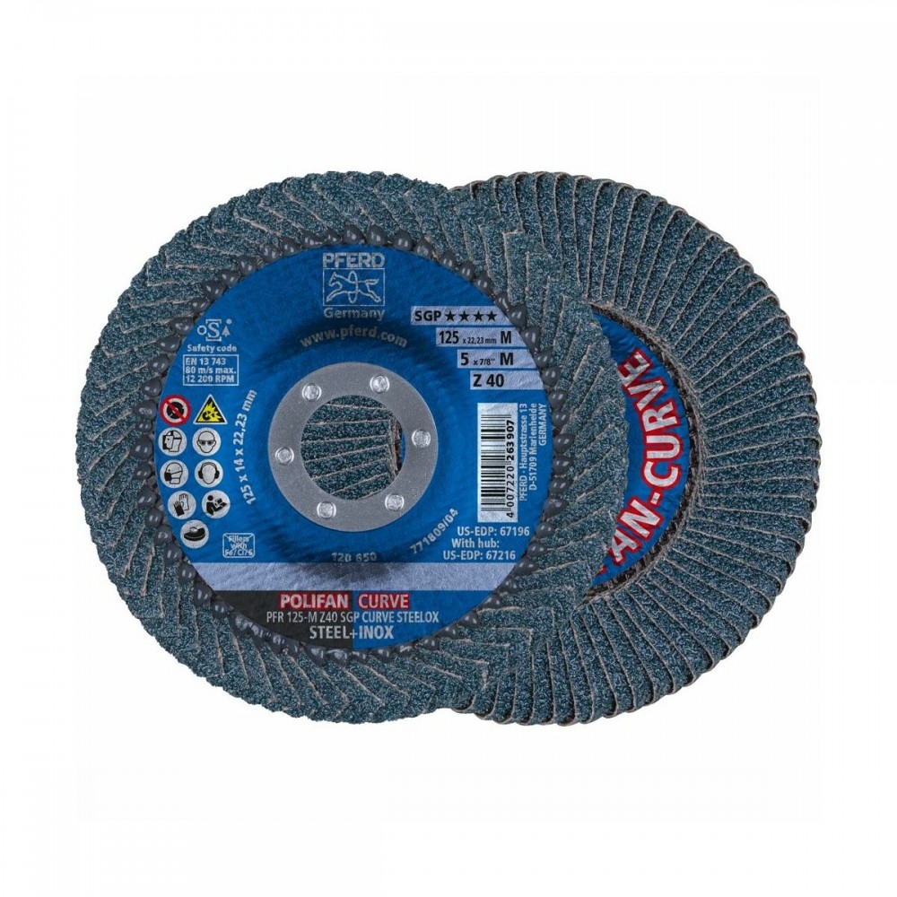 Pferd POLIFAN PFR 125-M Z40 SGP CURVE STEELOX - абразивний пелюстковий круг, було спеціально розроблене для роботи з кутовими швами. Це єдиний у світі пелюстковий диск, який має пелюстки як на шліфувальній, так і задній стороні, а також по радіусу. Під час роботи рекомендується дотримуватися 12200 об/хв.